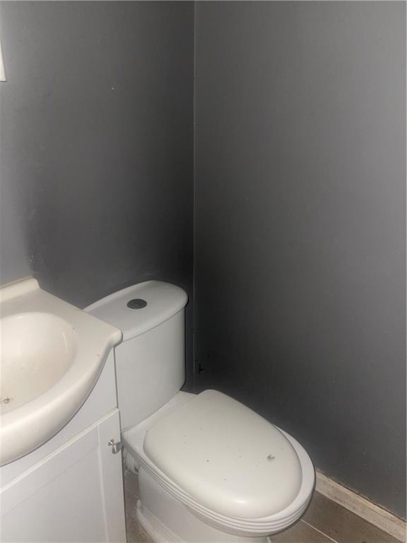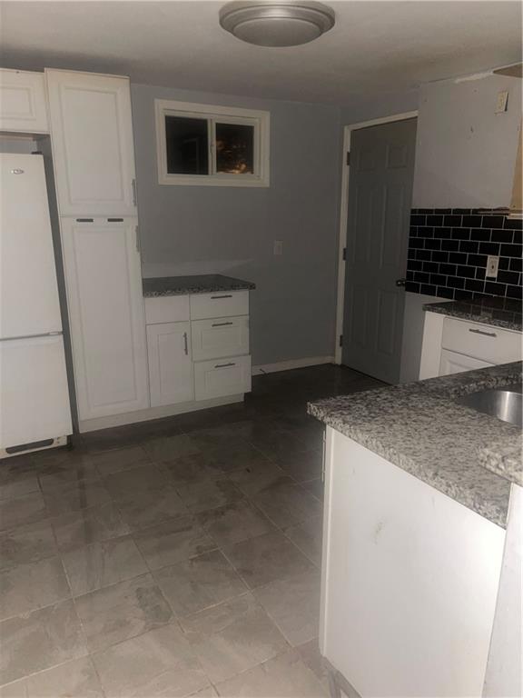 Kitchen featuring refrigerator, white cabinetry, tasteful backsplash, and dark tile patterned floors