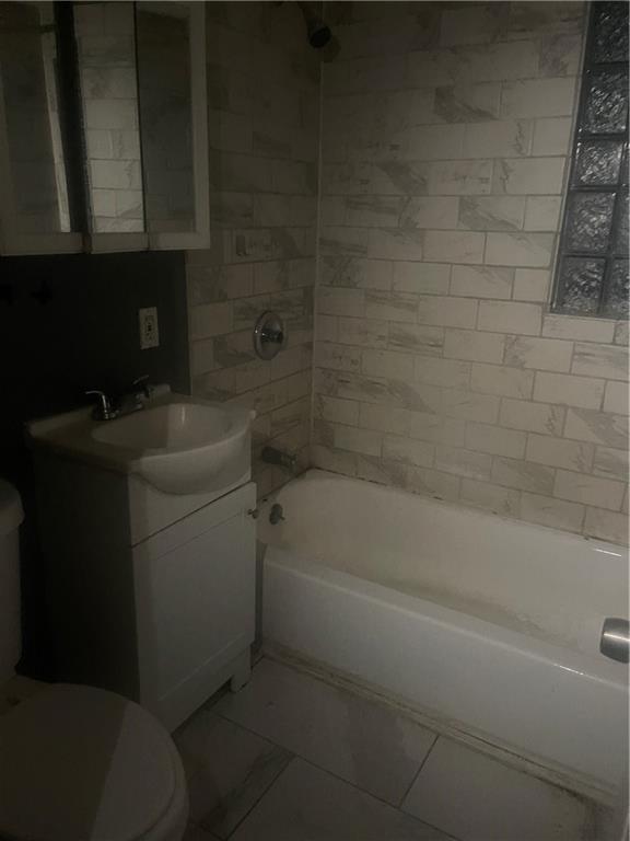 Full bath with washtub / shower combination, vanity, and light marble finish flooring