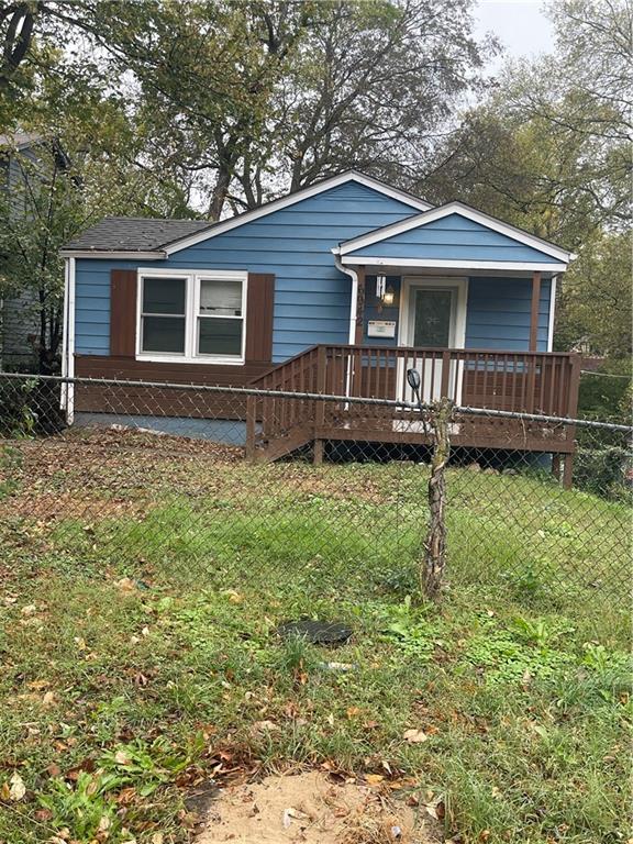 Bungalow-style house featuring a fenced front yard and a wooden deck