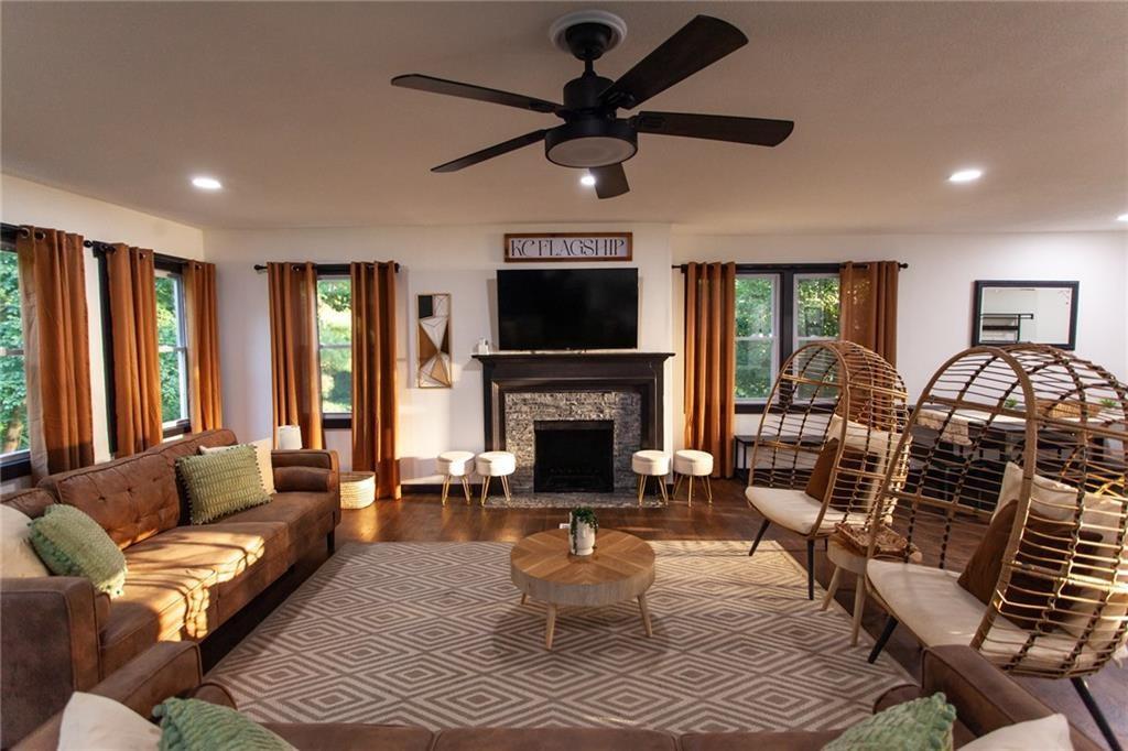 Living area with a stone fireplace, wood finished floors, recessed lighting, and ceiling fan