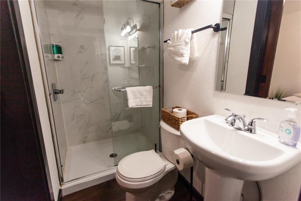 Bathroom featuring a textured wall, a marble finish shower, and dark wood-style flooring