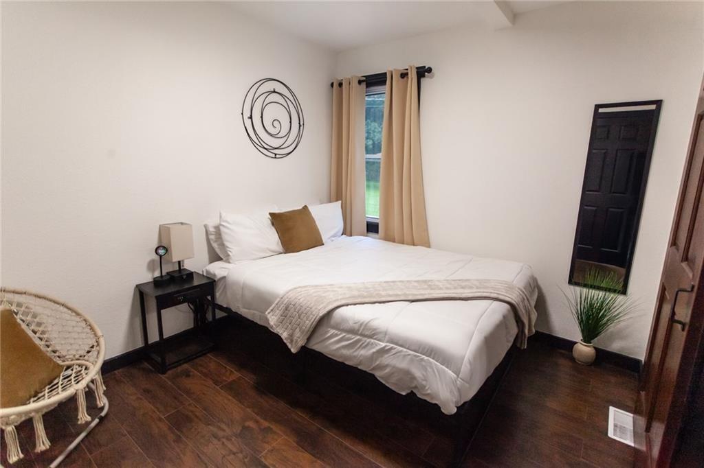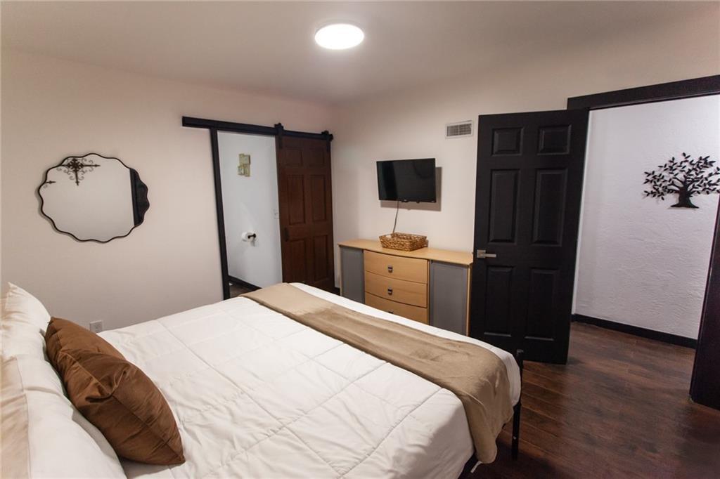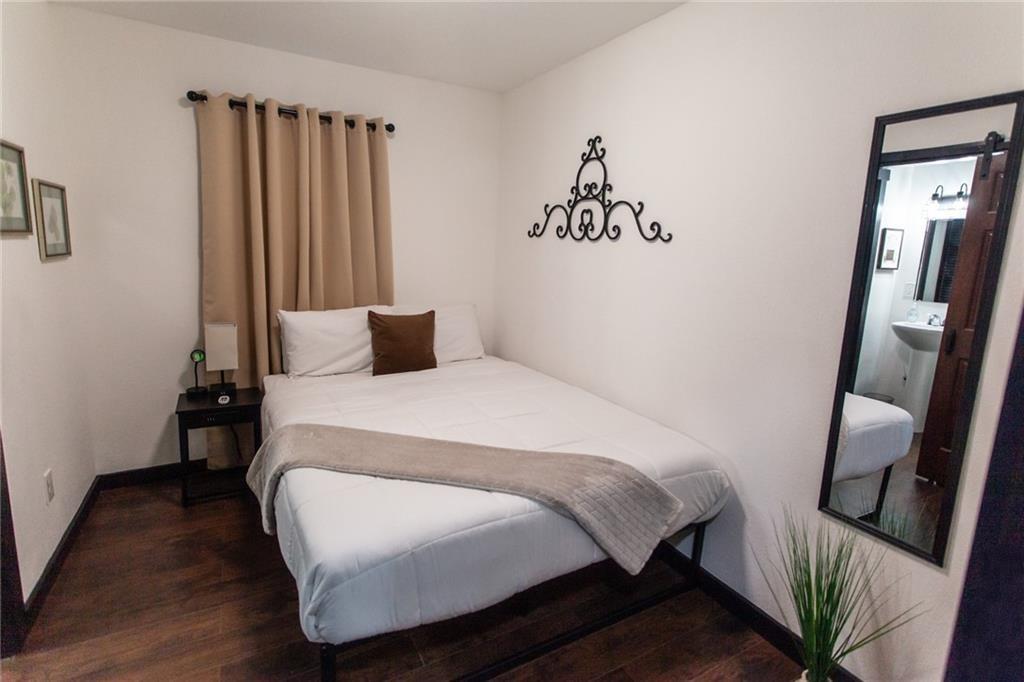 Bedroom with dark wood-type flooring and ensuite bathroom
