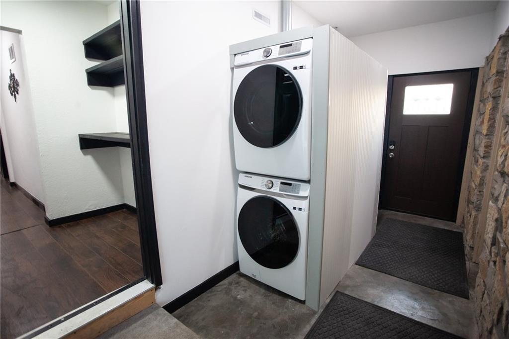 Laundry area featuring stacked washer and clothes dryer and baseboards