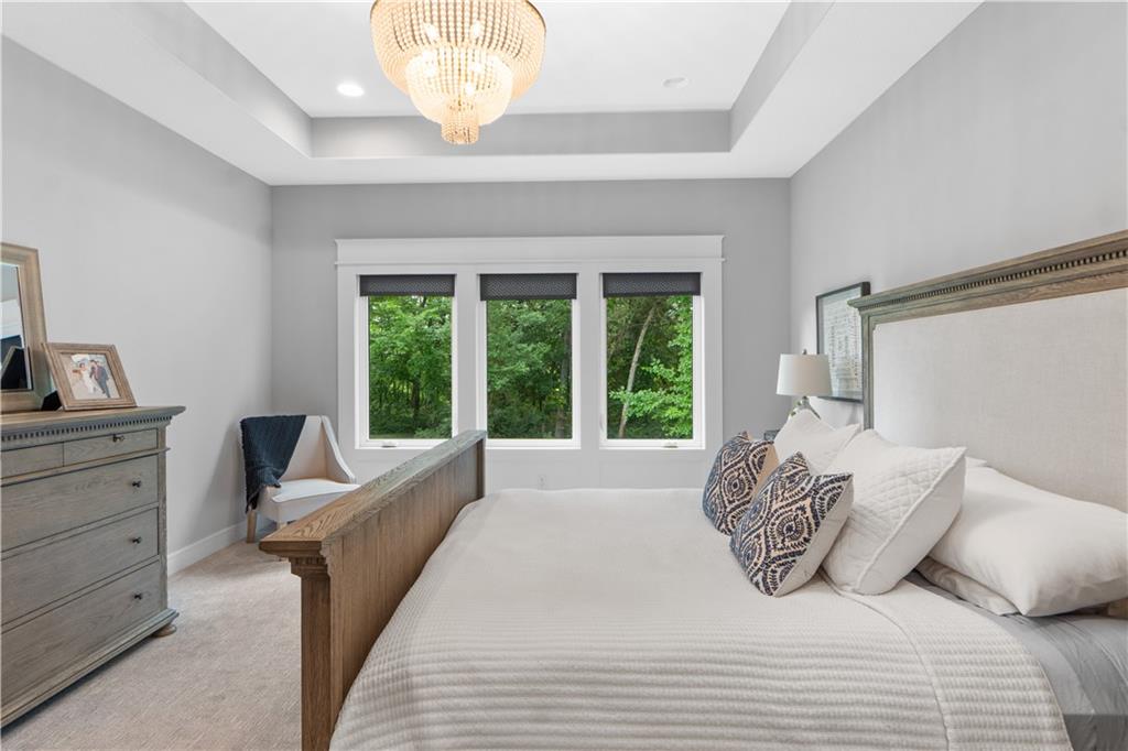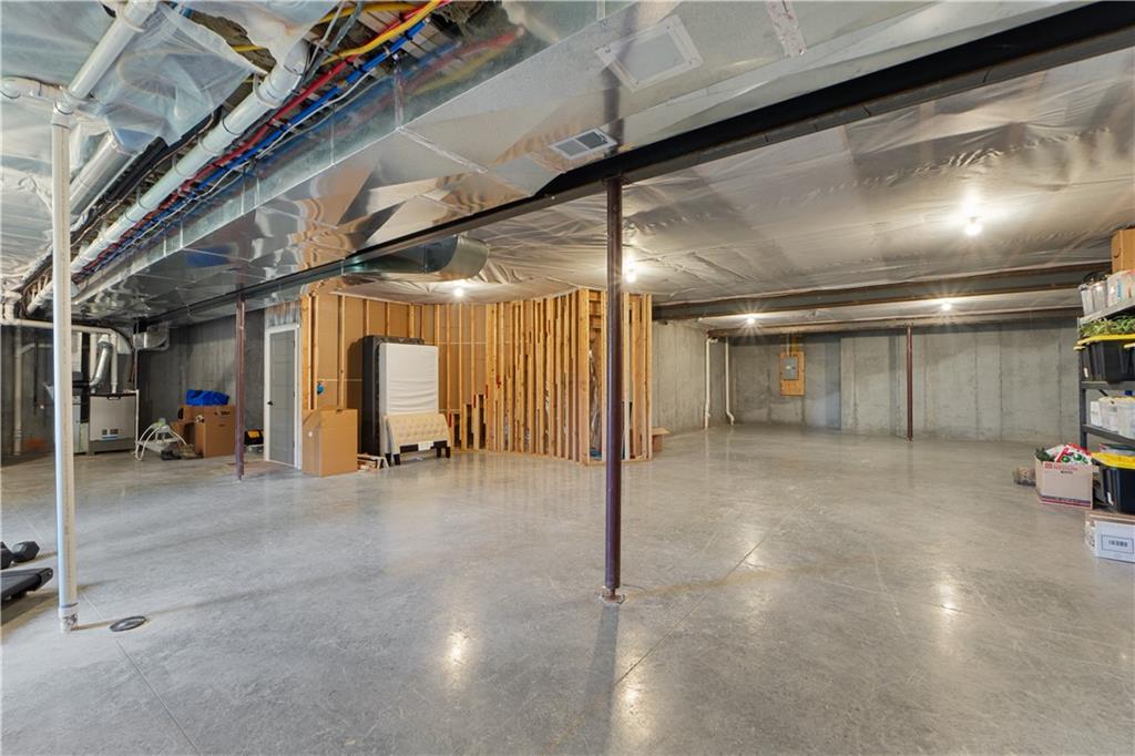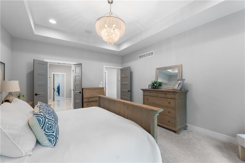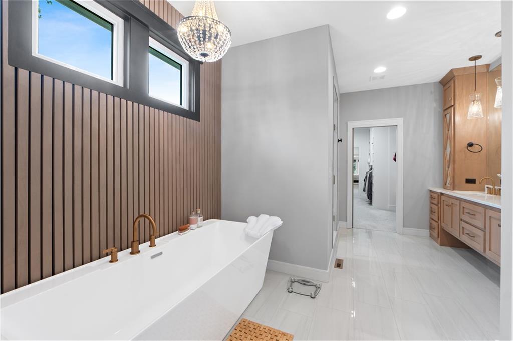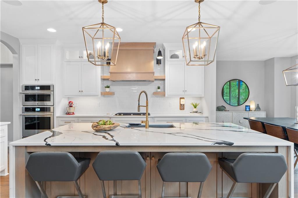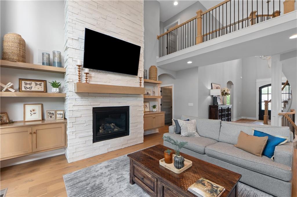 Immersed in natural elegance on .66 acre treed lot, this 5-bedroom, 4 car garage home is meticulously designed for luxury and comfort. Custom built by JFE Construction in the small private Timberstone Ridge community. Lush landscaping leads you to the cedar lined vaulted ceiling on the front porch through mahogany double doors. Inside you are greeted by a stunning curved floating staircase and 6” white oak hardwood floors flowing seamlessly across the open main level illuminated by a stunning chandelier and floor to ceiling stacked stone fireplace. The chef’s kitchen is a centerpiece: 10' waterfall island in Calcatta white & black quartz, floating shelves, custom range hood and gas cooktop. JennAir dual convection ovens (with recipes & wifi), industry-grade refrigerator and freezer. Unique glassed in Wine Cellar and walk-in pantry complete the kitchen. The dining space is perfect for large gatherings with it's ample space. Oversized double sliding doors open to bring the outside in and make the covered composite deck additional living space to relax or entertain with treed views! The home also boasts numerous SMART HOME and wifi enabled features!! Main-floor Primary Suite is a true retreat and the bathroom is spa-inspired with Calcatta Macchia Vecchia Quartz double vanities, statement pendant lights, and soaking tub. Fabulous walk-in closet includes a vanity area & extra outlets. Upstairs are 3 more bedrooms w/walk-in closets & 2 baths that maintain the high-end finishes. Daylight lower level is ready to be finished & pre-plumbed for a bathroom. A mudroom leads to the extra-deep, 4-car garages-with insulated wooden doors provide abundant space for large vehicles or gear. Outside, privacy abounds thanks to the treed yard and oversized lot, accented in front by a large retaining wall and lush landscaping. Bold black-framed windows (midnight on white) add architectural drama to the curb appeal. Walk to Cedar Niles Park/trail. Minutes from Lake Olathe!