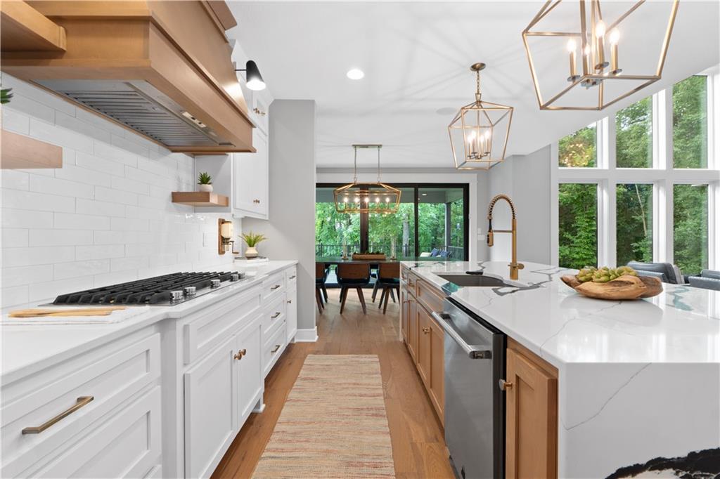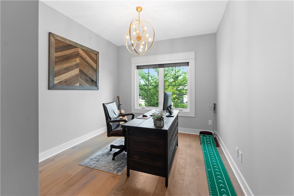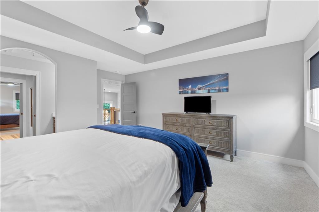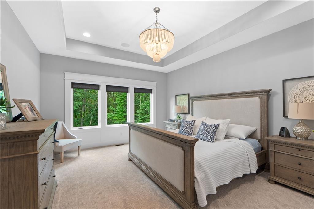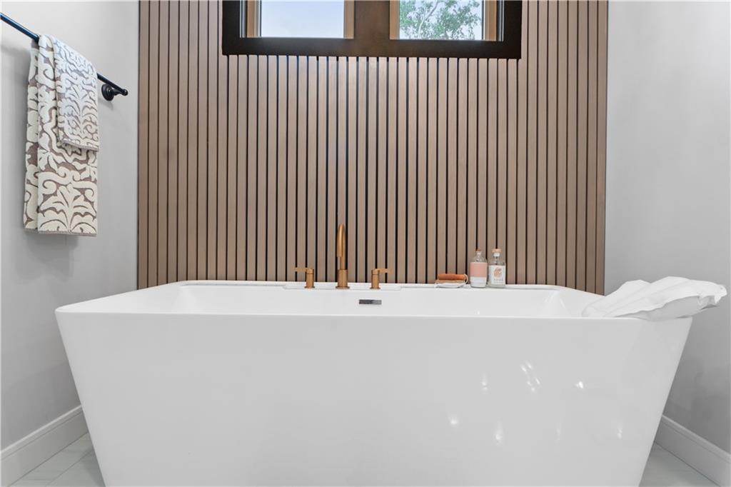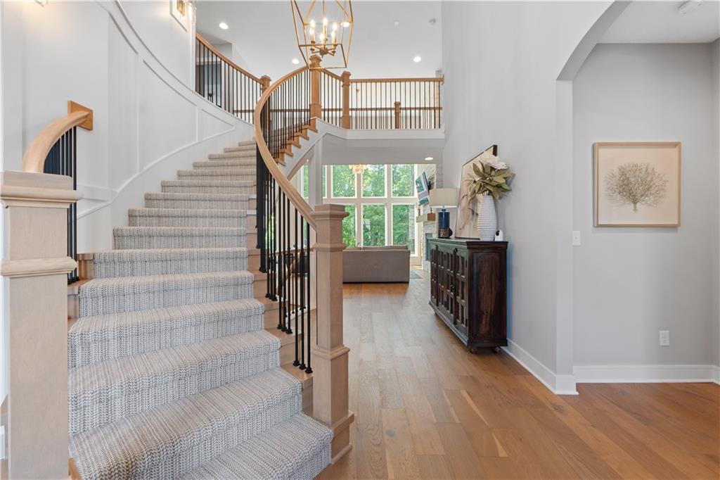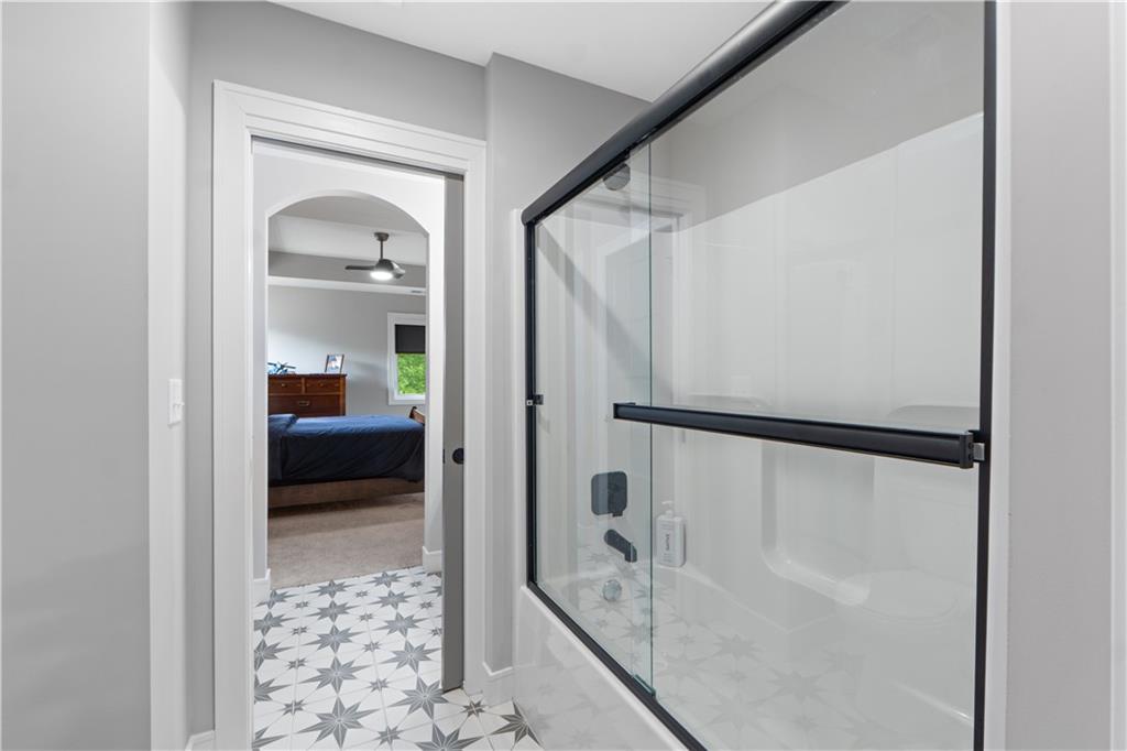 Immersed in natural elegance on .66 acre treed lot, this 5-bedroom, 4 car garage home is meticulously designed for luxury and comfort. Custom built by JFE Construction in the small private Timberstone Ridge community. Lush landscaping leads you to the cedar lined vaulted ceiling on the front porch through mahogany double doors. Inside you are greeted by a stunning curved floating staircase and 6” white oak hardwood floors flowing seamlessly across the open main level illuminated by a stunning chandelier and floor to ceiling stacked stone fireplace. The chef’s kitchen is a centerpiece: 10' waterfall island in Calcatta white & black quartz, floating shelves, custom range hood and gas cooktop. JennAir dual convection ovens (with recipes & wifi), industry-grade refrigerator and freezer. Unique glassed in Wine Cellar and walk-in pantry complete the kitchen. The dining space is perfect for large gatherings with it's ample space. Oversized double sliding doors open to bring the outside in and make the covered composite deck additional living space to relax or entertain with treed views! The home also boasts numerous SMART HOME and wifi enabled features!! Main-floor Primary Suite is a true retreat and the bathroom is spa-inspired with Calcatta Macchia Vecchia Quartz double vanities, statement pendant lights, and soaking tub. Fabulous walk-in closet includes a vanity area & extra outlets. Upstairs are 3 more bedrooms w/walk-in closets & 2 baths that maintain the high-end finishes. Daylight lower level is ready to be finished & pre-plumbed for a bathroom. A mudroom leads to the extra-deep, 4-car garages-with insulated wooden doors provide abundant space for large vehicles or gear. Outside, privacy abounds thanks to the treed yard and oversized lot, accented in front by a large retaining wall and lush landscaping. Bold black-framed windows (midnight on white) add architectural drama to the curb appeal. Walk to Cedar Niles Park/trail. Minutes from Lake Olathe!