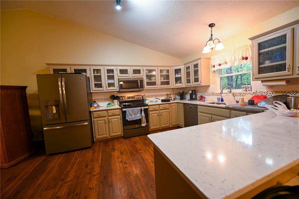 Peaceful Ozark Retreat on 5.5± Acres Welcome to your new well-kept forever home is tucked away on 5.5± quiet, private acres in the heart of the Ozarks! This 3-bedroom, 2-bath home has an open floor plan that is great for relaxing or entertaining. The brick wood-burning fireplace is floor to ceiling focal point that helps warm the wide open living spaces. Wall to wall wood flooring through out the living room, while the updated kitchen features new Corian countertops, custom cabinetry, and modern appliances. Have that morning coffee in the sunroom while watching nature, or unwind on the covered front porch or back deck as deer and turkey wander by. The detached garage/workshop provides plenty of storage and workspace. Every hunter will appreciate the deer stand in the wooded section. With updates including newer windows, roof, flooring, and more, this property is move-in ready. Trade the city streets for country peace and make this your forever home! Priced to sell!
