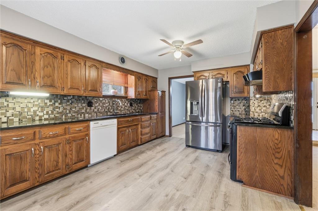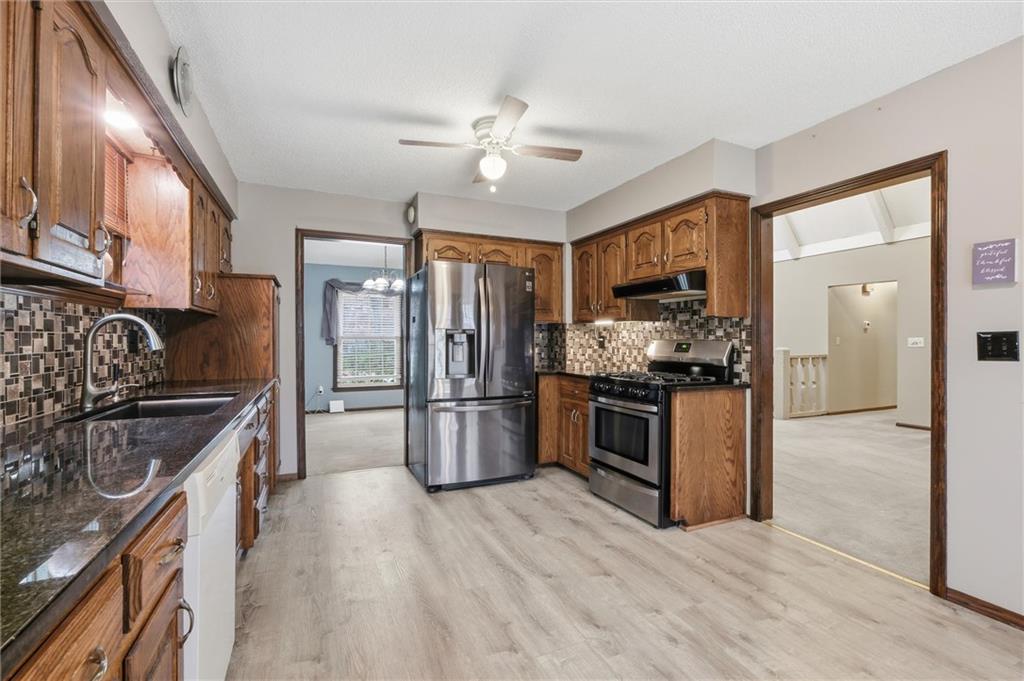 Main-Level Living in Lee's Summit! Spacious Layout, Huge Deck & Endless Possibilities. Discover the perfect blend of comfort, function, and flexibility in this home offering true main-level living and room to grow. Step inside to a warm and inviting great room featuring a cozy brick fireplace, vaulted ceilings, and classic wood beams that add character and charm. The eat-in kitchen is bright and practical with granite countertops and durable LVP flooring...ideal for busy everyday life. A formal dining room (or optional living room/office) gives you the versatility every modern household needs. Your primary bedroom retreat is conveniently located on the main floor and features three closets, a full bath, and its own walkout to the deck and backyard... perfect for morning coffee or evening relaxation. Bedrooms 2 and 3 are also on the main level along with a second full bath and the main-floor laundry. Head downstairs to a spacious recreation room... great for movie nights, game days, or hobbies. The 4th bedroom (may be non-conforming) offers plenty of possibilities and includes its own walkout door to the garage. A fantastic workshop/storage space is accessible from the exterior, ideal for tools, equipment, or projects. Outside, the oversized flat driveway provides room for extra cars, an RV, or even a basketball court. The large, fenced backyard is a true highlight with its newly built, oversized deck... made for entertaining, grilling, or relaxing under the stars. This home checks all the boxes: space, updates, flexibility, and an unbeatable lot. Don’t miss your chance to make it yours!
