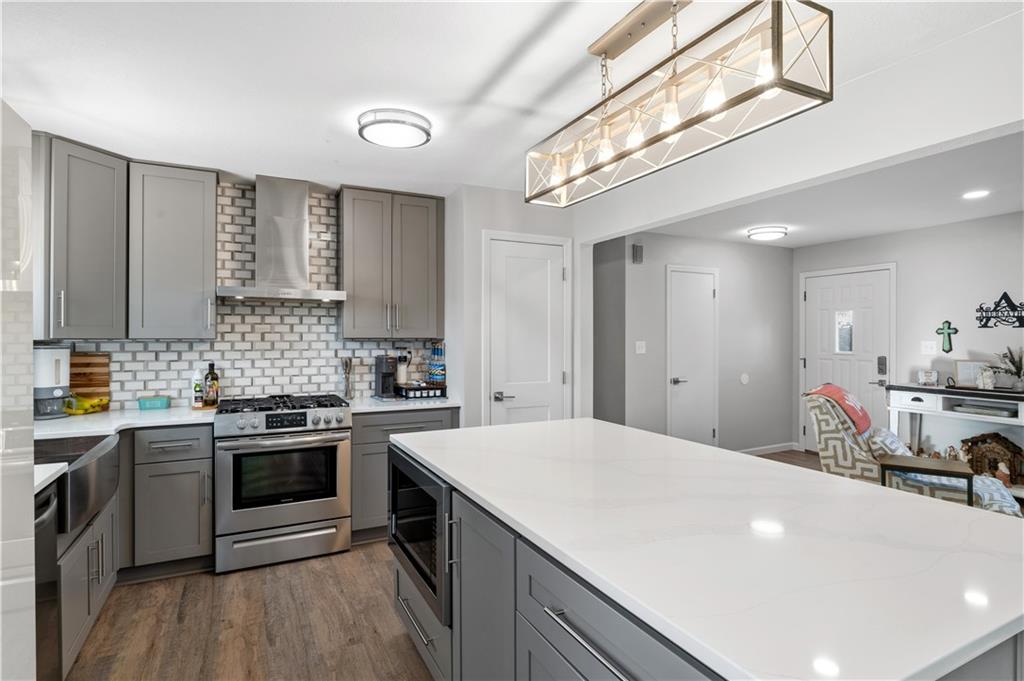 Meticulously maintained 4-bedroom, 2 bath, nestled near the heart of Parkville. This clean, move-in-ready home features nearly 1842 square feet of living space. Open- concept living room with cozy fireplace flows into the stunning eat-in kitchen with new cabinetry, oversized center island with built in microwave, new stainless-steel appliances, and tile backsplash. Primary bedroom includes private en-suite with tiled shower. Two additional bedrooms share a second full bath. Walk-out lower level offers a fourth bedroom AND a bonus rec room for entertaining. Detached outdoor deck perfect for grilling and relaxing. Rear-entry 2-car garage with abundant driveway parking. Neighborhood Park with-in walking distance. Easy access to top-rated schools, shopping and dining, you will enjoy the best of suburban living with the vibrant KC lifestyle just a stone's throw away.