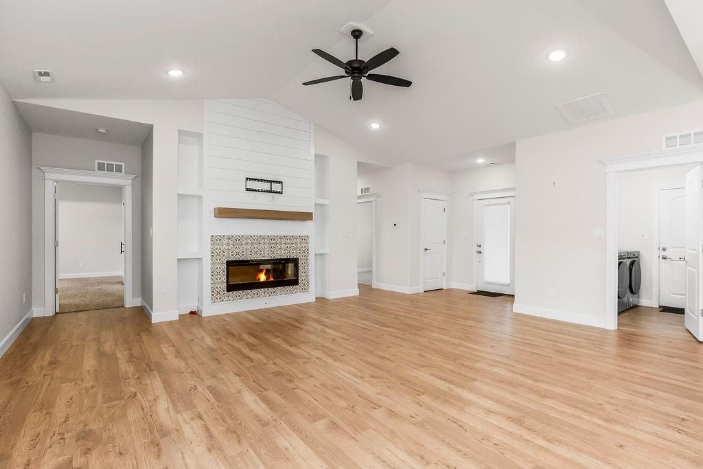 This beautifully updated ranch combines comfort, style, and effortless single-level living. The living room features a cozy fireplace and flows into a bright, two-tone kitchen with white upper cabinets, warm wood lower cabinets, quartz countertops, a center island, and a pantry—perfect for cooking and entertaining. Three spacious bedrooms include a primary suite with wood ceiling accent, a double vanity, and a bath with playful green touches. Outside you will find a fenced backyard with a patio, and enjoy the convenience of a three-car garage. This move-in ready home is as functional as it is inviting.