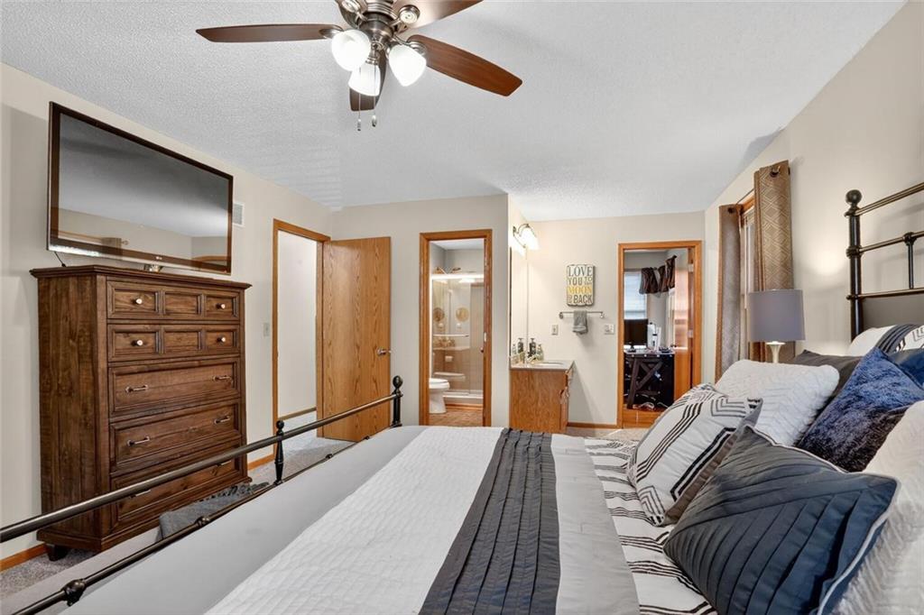 Peaceful Setting in Windmill Springs on an extra-large level (just over an acre!) Lot outside city limits w/no HOA, this 3 Bedroom, 2.5 Bath home offers flexible space for daily living. Entry features a vaulted ceiling, coat closet, & all-new LVP on the main level. The Great Room centers on a masonry brick Fireplace w/oak mantle & brick hearth, 17' Vaulted Ceiling, custom-blind Windows on two sides, library panel to chair rail, Ceiling Fan, & LVP. The Eat-In Kitchen includes black granite Countertops, ceramic tile Backsplash, oak raised-panel Cabinets, under-cabinet lighting, a corner composite farmhouse Sink framed by dual Windows, & a Pantry w/adjustable shelves. Stainless Appliances: Electric Range, Dishwasher & Refrigerator; black Built-In Microwave. Dining opens to a Composite Deck w/aluminum railing that steps to the Backyard. Main-level Laundry offers cabinets & extra storage. A Half Bath is conveniently located on the main level. Upstairs, the Primary Bedroom connects to a Flex Space/Office. The Primary Bathroom features two vanities, an upgraded cultured marble Shower w/glass doors & built-ins, and generous linen storage. Two additional Bedrooms are connected by a Full Bath. A T-shaped Hallway overlooks the Great Room & includes a built-in linen cabinet. The Front-Entry Garage is extra deep for vehicles(3 cars fit), gear, or workshop use, offering insulated Doors w/openers, finished walls & ceiling, over-nine-foot Ceiling height, built-in shelving, work bench, a side Window, & walkout access to the Backyard. Lower Level provides daylight Windows, tall ceilings, storage, & future finish potential. Systems include a Lennox heat pump & a Rheem water heater. Outdoor living adds a fenced garden area, mature trees, a fire-pit, a long concrete Driveway, & a quiet Cul-de-Sac setting. Served by Blue Valley School District. Everyday needs are close by across south Johnson County w/ quick connections to US-69 & 179th Street for commuting, parks, & community amenities.