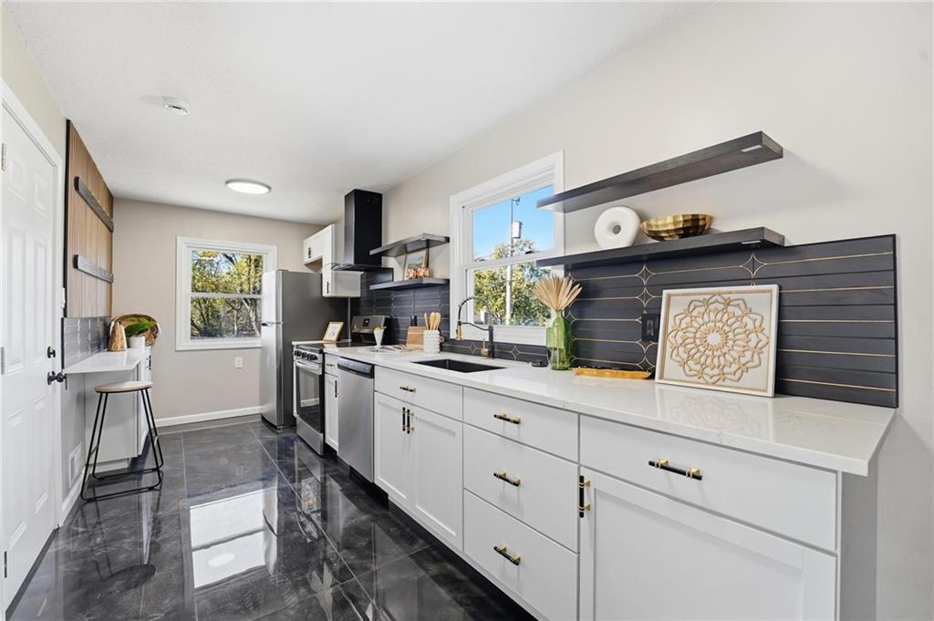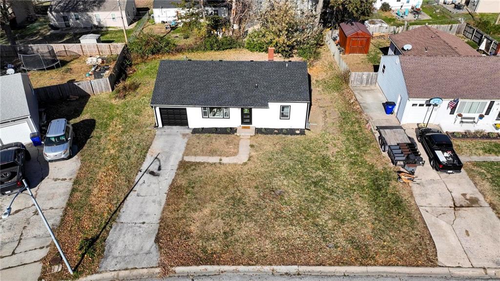 Beautifully Renovated Ranch in the Heart of the Northland! This fully updated 3-bedroom, 2-bathroom ranch-style home offering modern finishes, timeless design, and unbeatable convenience in Kansas City’s Northland. Recent exterior improvements include new siding, new windows, and a new roof, providing long-term peace of mind and excellent curb appeal. Inside, a bright and inviting living space features refinished hardwood floors, fresh neutral paint, and updated trim and hardware for a clean, cohesive feel. The stunning designer kitchen serves as the centerpiece of the home, showcasing sleek black tile accents with gold detailing, quartz countertops, open shelving, new stainless steel appliances, and upgraded cabinets and hardware. The dining area sits just off the kitchen for easy everyday living and entertaining. Both bathrooms have been fully remodeled, featuring modern tilework, stylish lighting, and high-quality fixtures. All three bedrooms offer comfortable space with updated finishes throughout. The expansive unfinished basement is freshly painted and ready for storage, a workshop, or future expansion. A one-car garage and large driveway provide convenient off-street parking. Outside, the freshly painted concrete patio offers a perfect spot for outdoor dining and relaxation. Located minutes from dining, shopping, schools, and major highways, this home blends style, comfort, and location into one incredible opportunity. Don’t miss your chance to own this beautifully updated Northland ranch!