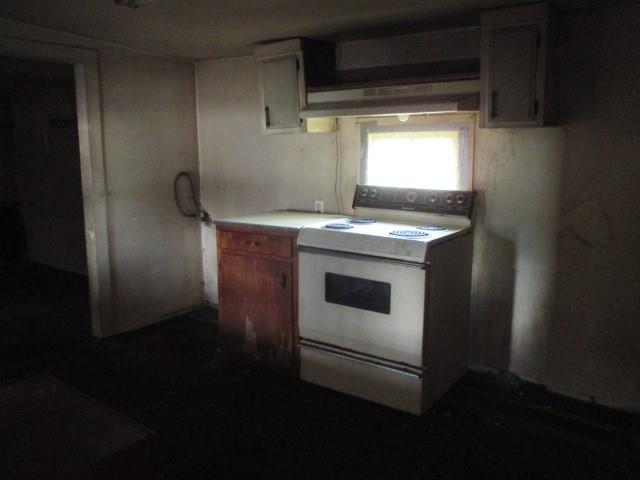 Kitchen featuring white range with electric stovetop, under cabinet range hood, and light countertops