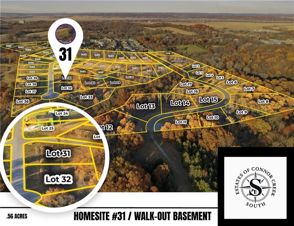 JUST OVER ½ ACRE, CORNER, WALK-OUT "BUILD READY" HOME SITE #31 = Where Luxury Breathes & Dreams Break Ground! A place where the horizon stretches wider, the air feels lighter & the promise of your future home begins long before the foundation is poured. On the edge of Kansas City, a new community “set apart” featuring a rare collection of homesites that have been carved into the rolling landscape just beyond the Legends in Kansas City, KS! A mix of sprawling .5+ acre to 1+ acre estate lots that invite you to design a residence worthy of your dreams. Each homesite offers sweeping views, surrounded by mature trees, open skies, and the quiet rhythm of nature—all set along winding paved streets with curbs, gutters + city sewer! Where countryside serenity meets effortless access in the award-winning Piper School District. A premier location just 20 minutes from KCI International Airport, the historic charm of Weston, the riverfront elegance of Parkville, the vibrant culture of Lawrence & the stability of Fort Leavenworth. With the Legends premier shopping, Homefield KCK Showcase Center, elite dining, endless entertainment, Sporting KC, NASCAR, with the NEW proposed Chiefs DOME Stadium & Sports Village just minutes away! Championship golf courses, natural sanctuary of WYCO Lake w/ chart-topping musical performances at an amphitheater. Finally, convenience is within reach—yet life feels wonderfully private. Existing Amenities help set the tone for elevated living w/o the wait. Those seeking guidance. Our ONSITE preferred custom builder stands READY to collaborate OR help you find the right builder & turn your dreams into reality! This is not simply a place to build a home, it is the beginning of your story! Take a scenic drive & preview this EXCLUSIVE collection of 56 beautiful homesites, each tucked into the reserved hills of this BRAND-NEW community, where your estate begins with a dream & rises into a life lived beautifully in the heart of Kansas City, KS.
