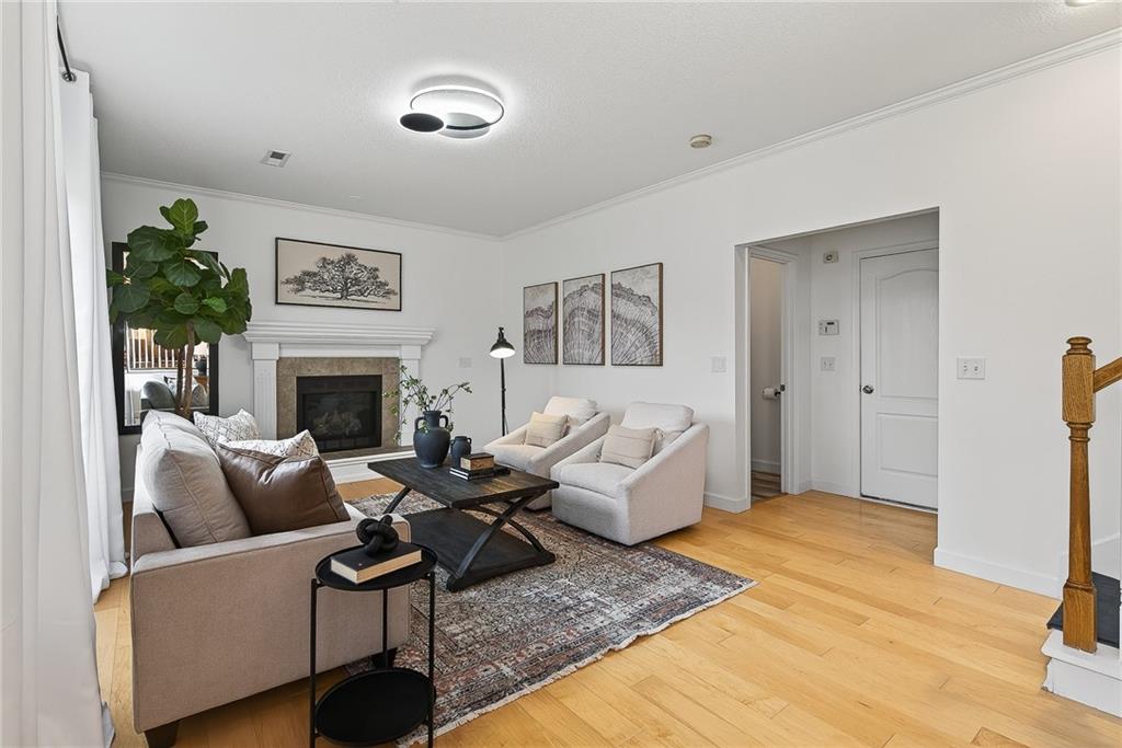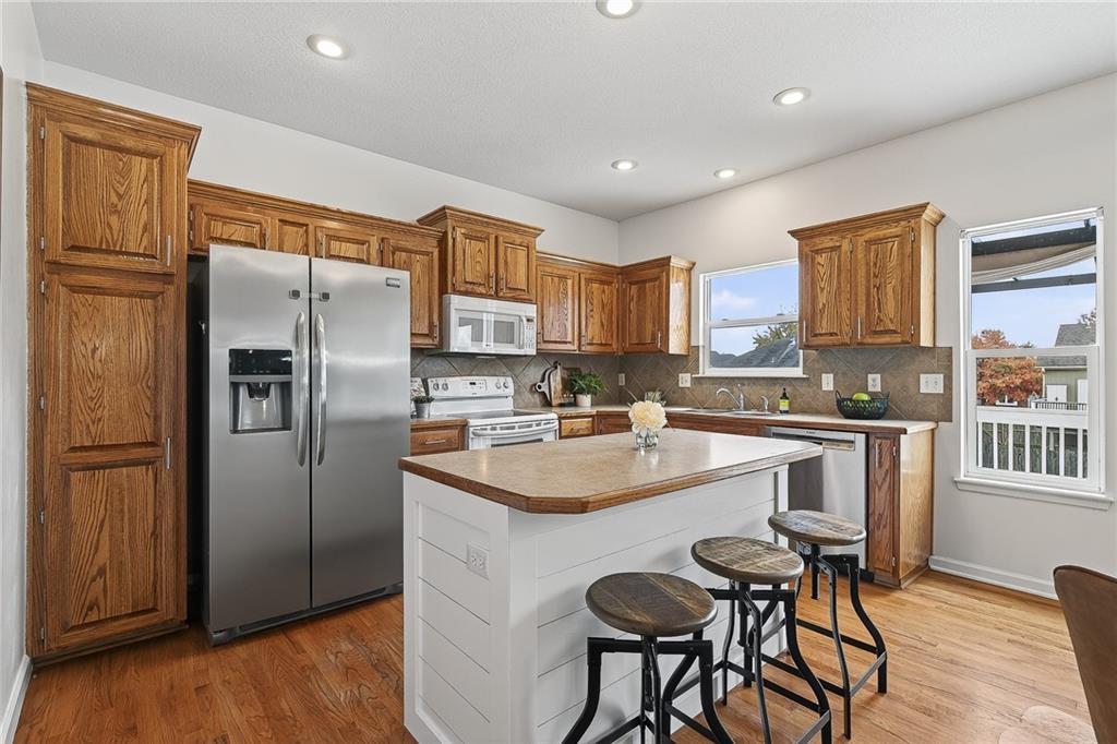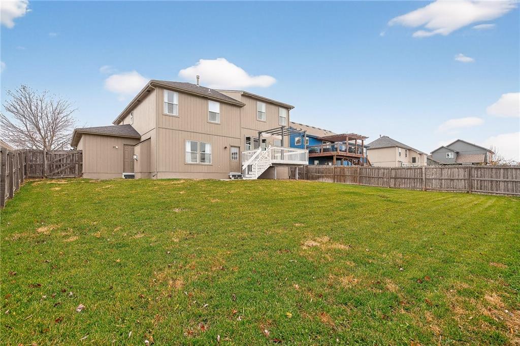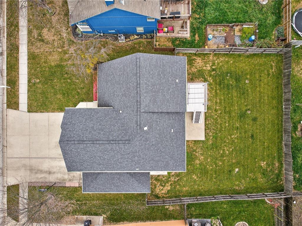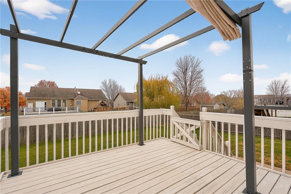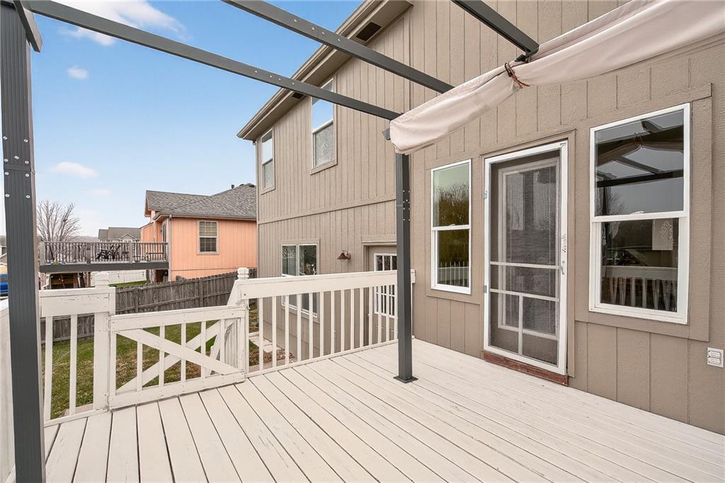 Beautiful Rosewood Hills atrium split with 4 bdrms, 2.5 baths, new roof (2024), over 2000 square feet of finished living space + bonus unfinished daylight sub-basement for storage and the workout area! Entryway with decorative boot bench, adjacent 2nd living area or formal dining room (you pick!), eat-in kitchen with island/breakfast bar with additional storage/seating, pantry, and walk-out great room with fireplace. Kitchen opens to the deck with pergola and steps down to the patio and large fenced yard with sprinkler system – perfect for pets, play, and BBQ! The primary vaulted suite features a sizeable walk-in closet with built-ins and ensuite bath featuring double vanities, walk-in shower and jetted tub. 4th private bedroom is on its own level with huge walk-in closet that could make a great home office + bonus door to the walk-in attic storage space. Additional features include: conveniently located bedroom-level laundry room, attic fan, all wood floors (with cork underlayment upgrade for sound, warmth), fresh interior/exterior paint, radon system, added insulation, 3-car extra deep garage with door to back yard, and built-ins/workbench for the tools. All appliances stay including newer fridge, washer and dryer. Excellent cul-de-sac location within walking distance to community pool, elementary, fun Rosewood Hills events, and easy highway access to all things KC!