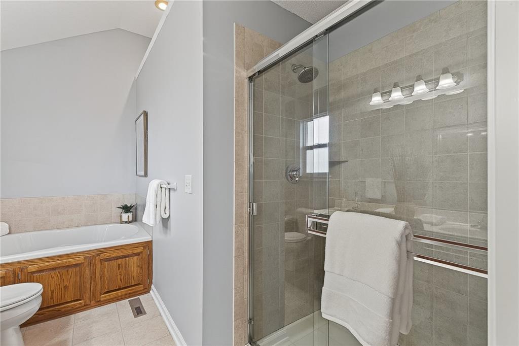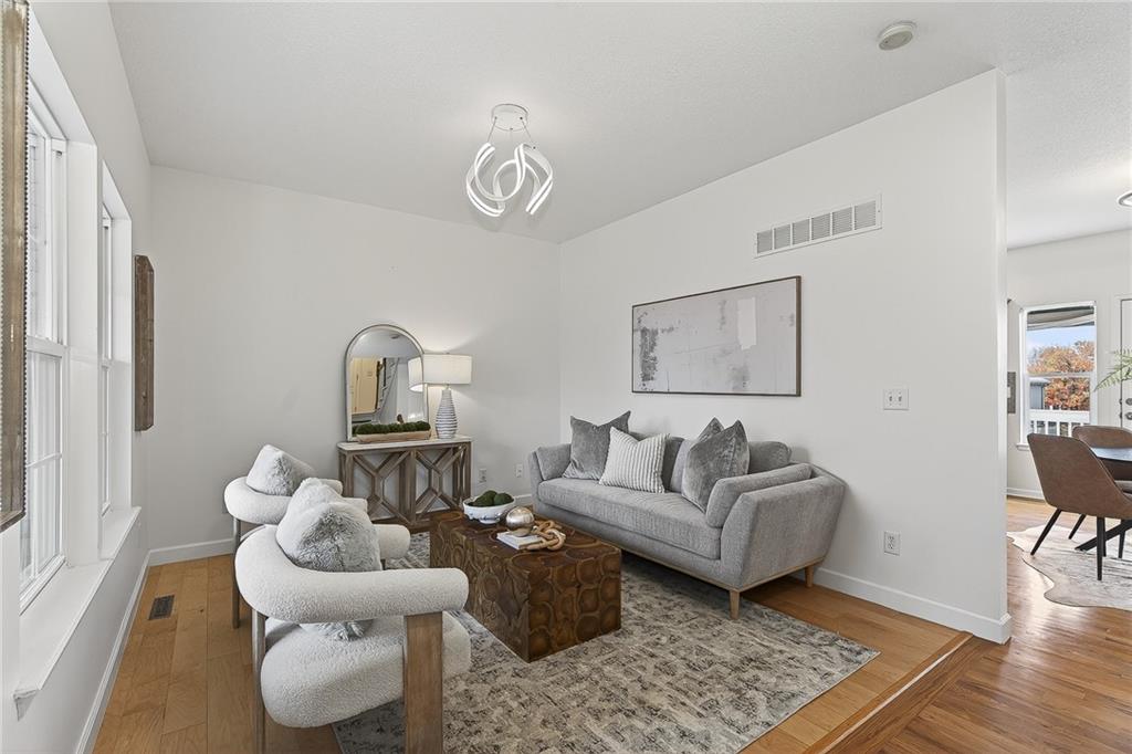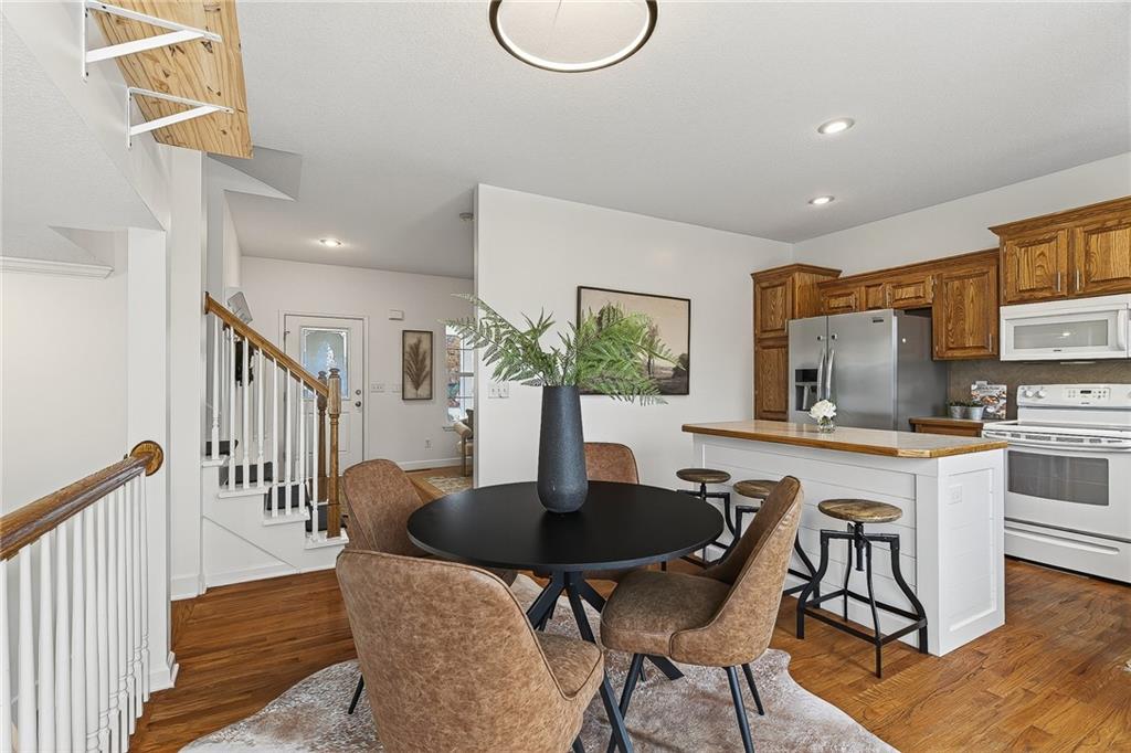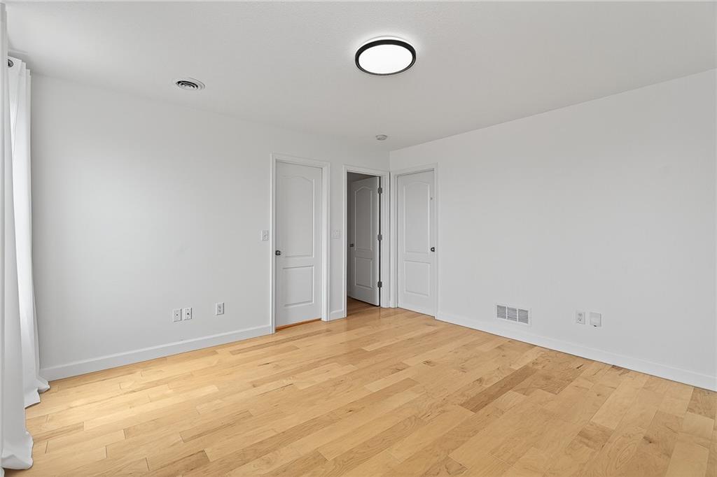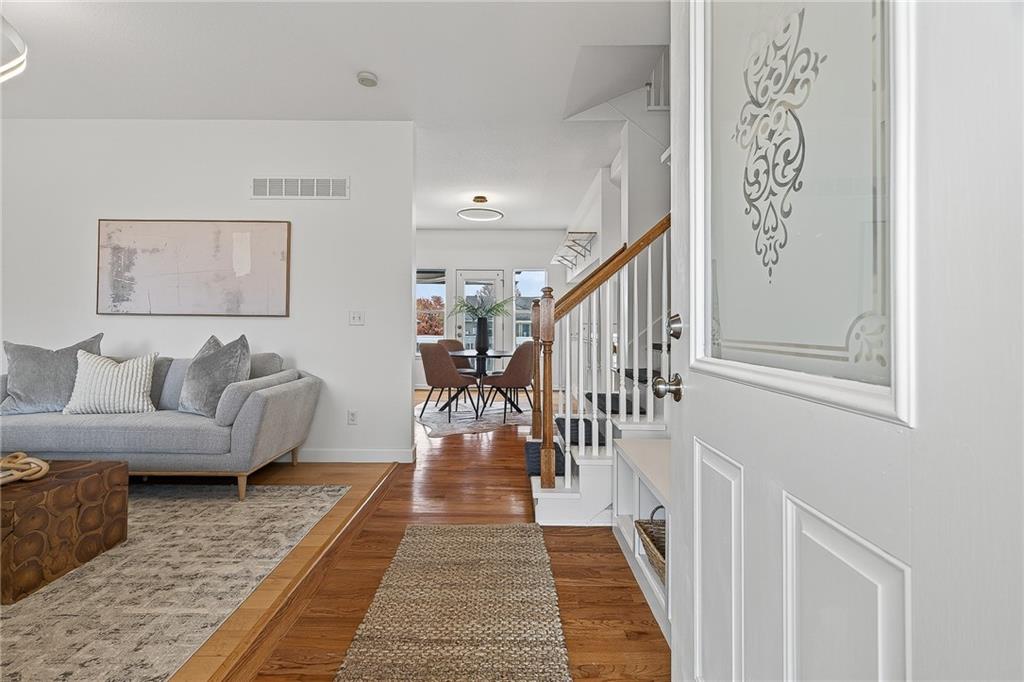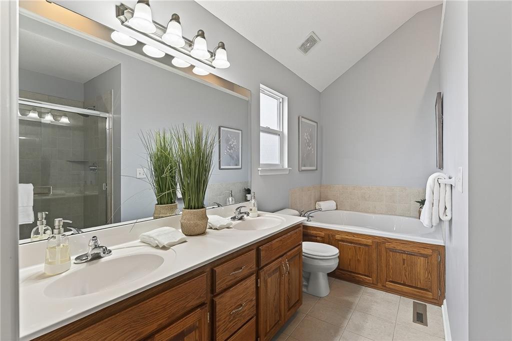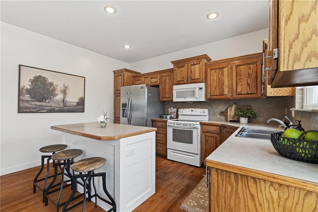 Beautiful Rosewood Hills atrium split with 4 bdrms, 2.5 baths, new roof (2024), over 2000 square feet of finished living space + bonus unfinished daylight sub-basement for storage and the workout area! Entryway with decorative boot bench, adjacent 2nd living area or formal dining room (you pick!), eat-in kitchen with island/breakfast bar with additional storage/seating, pantry, and walk-out great room with fireplace. Kitchen opens to the deck with pergola and steps down to the patio and large fenced yard with sprinkler system – perfect for pets, play, and BBQ! The primary vaulted suite features a sizeable walk-in closet with built-ins and ensuite bath featuring double vanities, walk-in shower and jetted tub. 4th private bedroom is on its own level with huge walk-in closet that could make a great home office + bonus door to the walk-in attic storage space. Additional features include: conveniently located bedroom-level laundry room, attic fan, all wood floors (with cork underlayment upgrade for sound, warmth), fresh interior/exterior paint, radon system, added insulation, 3-car extra deep garage with door to back yard, and built-ins/workbench for the tools. All appliances stay including newer fridge, washer and dryer. Excellent cul-de-sac location within walking distance to community pool, elementary, fun Rosewood Hills events, and easy highway access to all things KC!