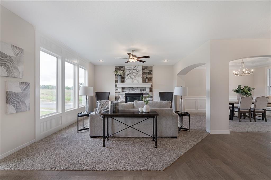 Levi II - Front Porch. This home is one of Prieb's most popular floor plans and features a large island in the kitchen and painted cabinets. There is a flex room on the main floor off the kitchen perfect for a home office with a full bathroom located close by. A stone fireplace in the great room and open floor plan are favorite features of this home. The primary bedroom has a huge primary bathroom with double vanities and granite countertops, separate shower and tub, and large walk-in closet. The laundry room is conveniently located next to the primary closet. The 3 secondary bedrooms upstairs are all spacious and have direct access to a bathroom. Home could close in 45 days or less.
