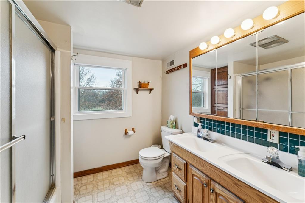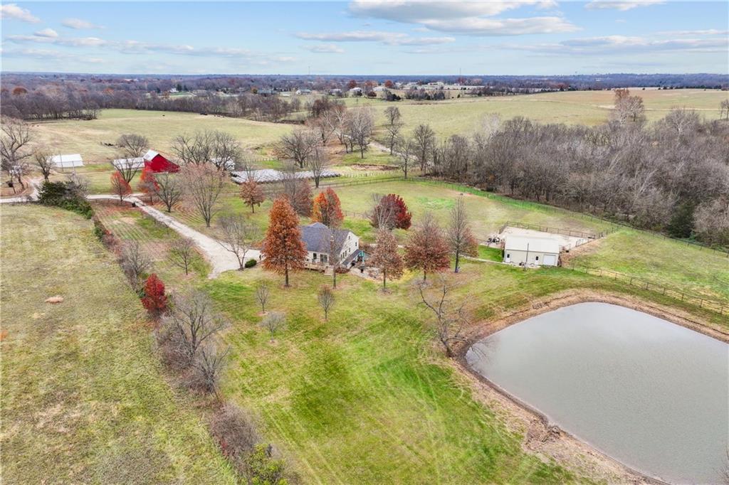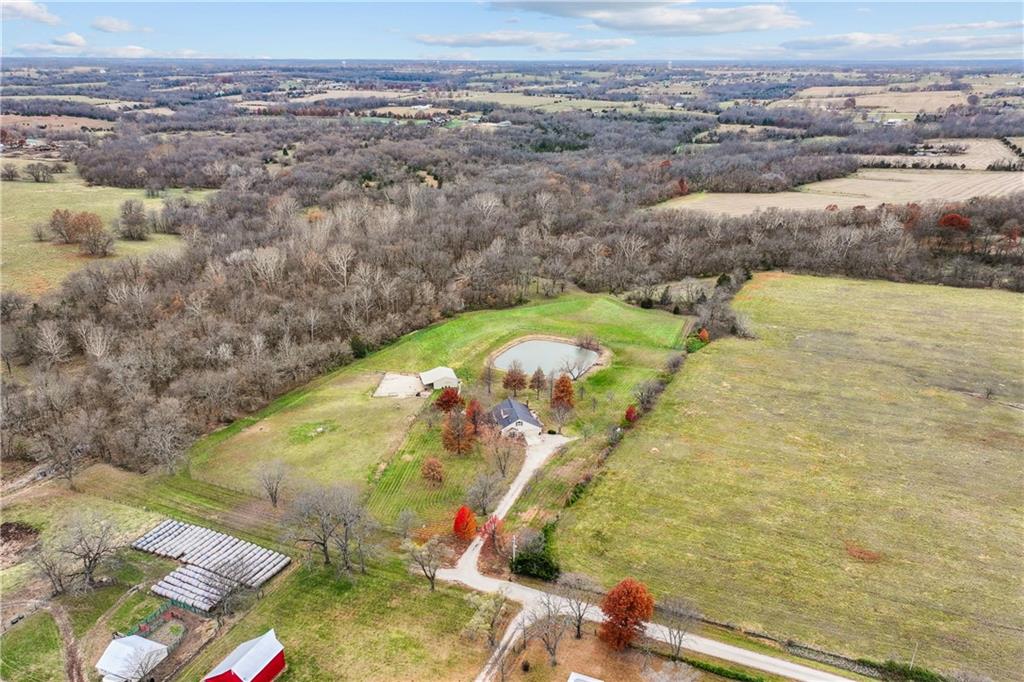 Just minutes from Overland Park and Louisburg, this 20-acre retreat offers unmatched privacy, incredible views, and a perfect blend of woods, pasture, and water. With ten acres of mature timber, ten acres of open pasture, a stocked, manicured pond, and Poney Creek running the full length of the property, it is the ideal blend of beauty and function. Horse ready and fully set up, the property includes horse safe fencing, cross fencing, a heated automatic waterer, three stalls with an attached run-in shed, a tack and storage room, plus water and electric in the barn. The home offers more than 3,100 square feet of comfortable, thoughtfully designed living space. Large windows and a brand-new deck capture sweeping views and daily wildlife. Inside, the great room is perfect for gatherings, and the kitchen is built for entertaining. Key updates give serious peace of mind. The home features 20 new thermal windows, a new sliding door, new gutters with guards, new composite siding with a 50-year transferable warranty, a one-year-old HVAC system, a one-year-old water heater, and a 5-year-old, 30-year roof. Follow the long private driveway to a property that feels secluded, peaceful, and truly special. This is a rare opportunity to live the outdoor lifestyle you want while staying close to the conveniences you need.