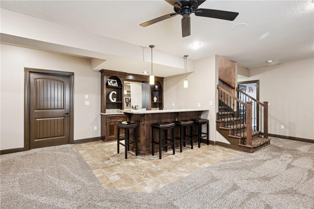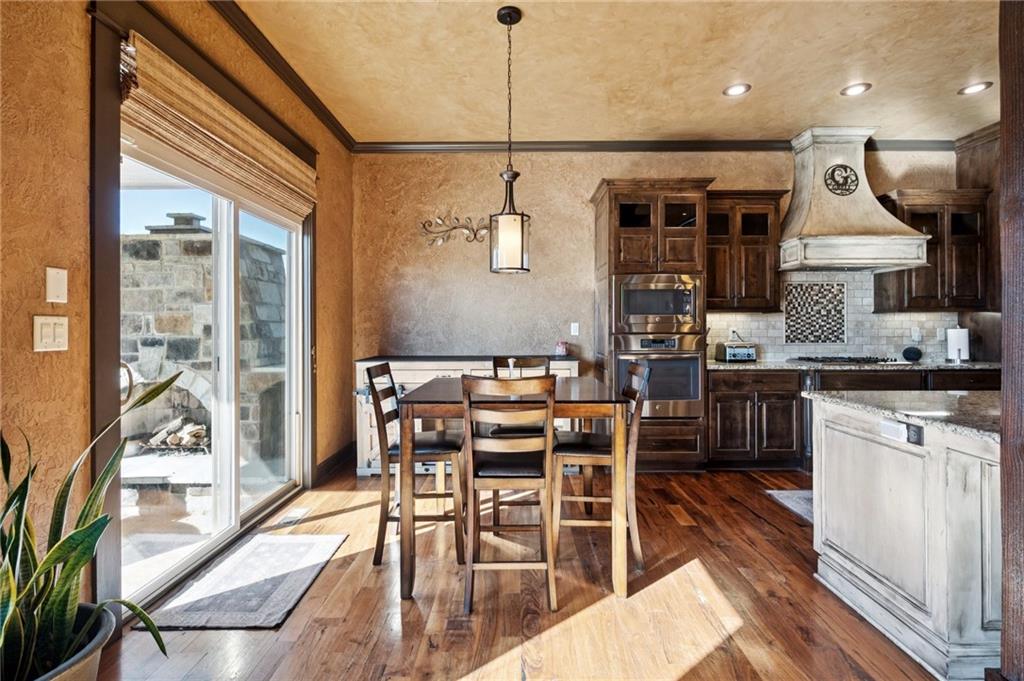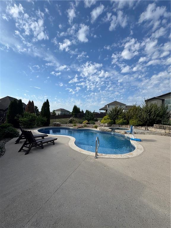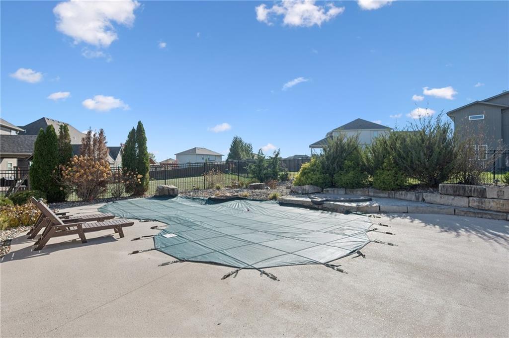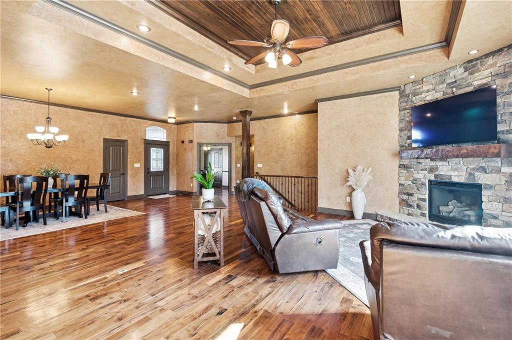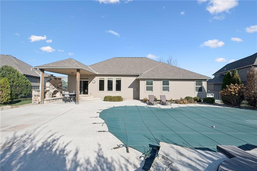 Amazing 5-bedroom, 4-bathroom ranch home located in the quiet Estates of Chapman Farms! This spacious, open-concept layout is designed for comfortable living and elegant entertaining. The main floor features a formal dining area, a large kitchen with a walk-in pantry, stainless steel appliances, gas cooktop, and a generous island overlooking the expansive great room with a cozy corner fireplace. A bright breakfast nook completes this inviting space. The main level includes a bedroom perfect for a home office, a second bedroom, and the primary suite—complete with a comfortable sitting room, a luxurious bathroom offering a separate glass shower and soaking tub, and a walk-in closet with abundant storage. The lower level is made for entertaining, showcasing a massive recreation room with a full wet bar and stylish accent wall—ideal for hosting parties, game nights, or movie marathons. Two additional bedrooms and two bathrooms provide plenty of room for guests, with extra unfinished space ready for storage, a hobby room, or a home gym. Step outside to your backyard oasis featuring a covered porch with a stone fireplace, plus a stunning in-ground pool and hot tub—perfect for relaxing or entertaining.