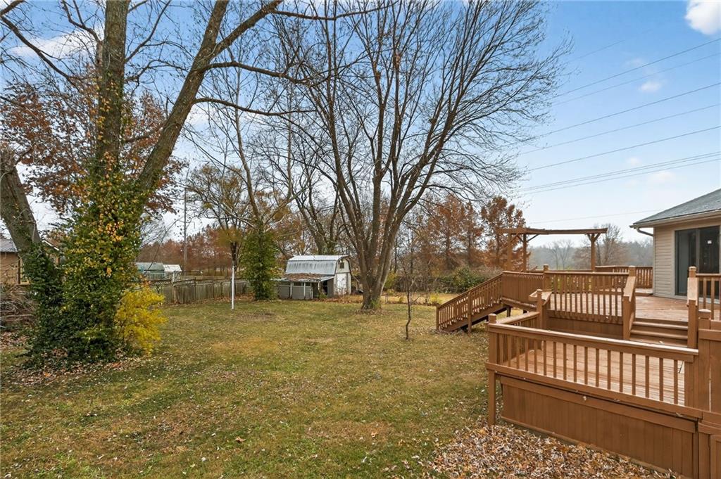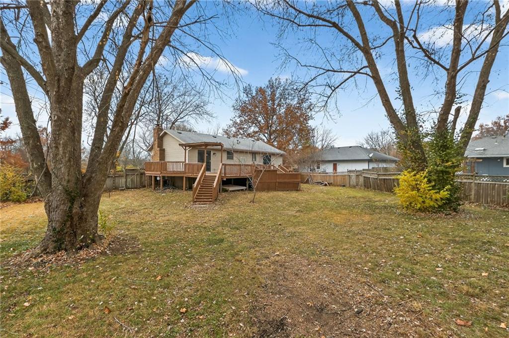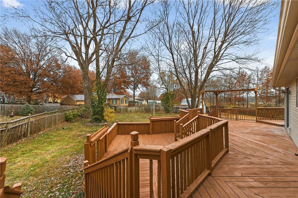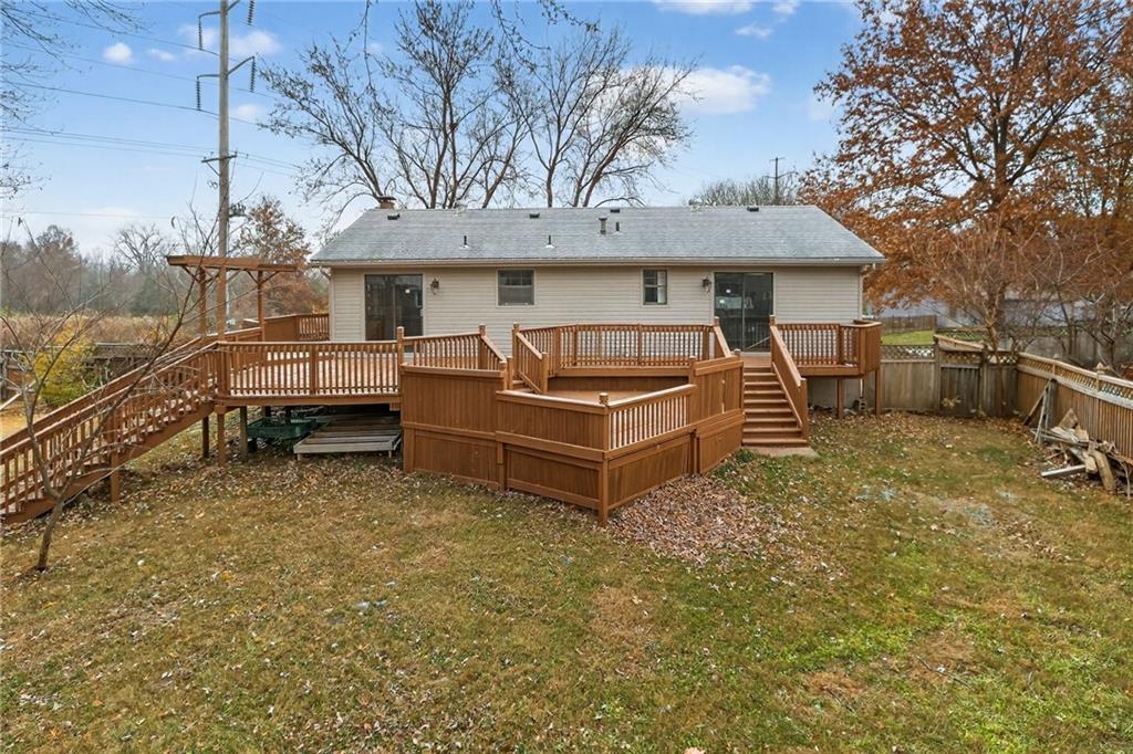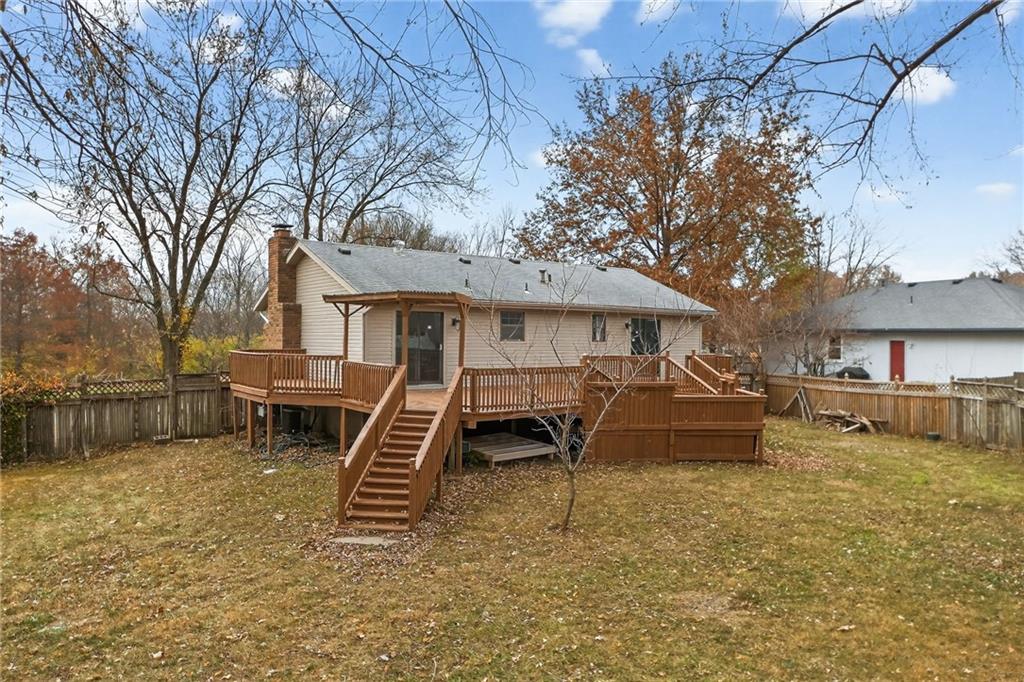 Welcome to your future home! This beauty has everything you could possibly look for in a house; elegance, updates, space, and privacy. This home features three large bedrooms in the first floor; master bedroom has its own full bathroom and double door to exit to the wrap around deck for a beautiful morning coffee. There are also two spacious bedrooms along with full bathroom in the hallway. The living room is large with big windows to offer daylight along with cozy wood fireplace. The kitchen is beautifully updated with lots of cabinets, new flooring, backsplash, lighting, and much more. The kitchen oversees the bright dining room that offers double door to exit to the huge deck overseeing the large green and private almost half an acre backyard. The lower level offers the forth bedroom along with a second fireplace, play area, cute play room for the little ones, the third full bathroom and laundry room. There are lots of storage space and exit to the double garage with workshop space, counter tops and plenty of space for your tools. The backyard is almost half an acre. In addition to the surrounding deck that oversees the yard, there is an extra lot that house a large shed that was used as a man cave. It is equipped with electricity and heat, has a TV and space in it and next to it for working on tools, cars, or any of your potential hobbies. Location is excellent and super close to downtown, Shops highways, and more! It is centrally located to Grandview, Raymore, Overland Park, Lee’s Summit, Kansas City, and SUPER CLOSE TO Long View Lake where Summer fund never ends!