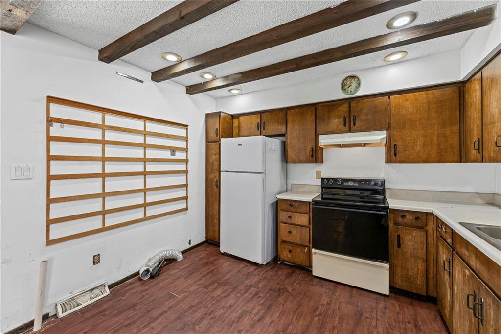 Cozy and full of character, this 2 bedroom, 2 bath ranch at 8801 E 109th is ready for its next chapter. Step inside to a vaulted great room with exposed wood beams, stone fireplace, and wood-look floors that give the space a warm, inviting feel. Large windows and a sliding glass door let in tons of natural light and walk out to the backyard. The spacious eat-in kitchen offers abundant cabinet and counter space, plus room for a dining table or island and sight lines back toward the living area—perfect for everyday living or entertaining. Down the hall you’ll find a comfortable primary bedroom with its own bath, a second bedroom, and an additional full bath. Outside, mature trees and a generous yard provide space for pets, play, or a future patio or garden. Conveniently located in south Kansas City with quick access to shopping, dining, and highways, this home is a great opportunity to move in now and add your personal updates over time.
