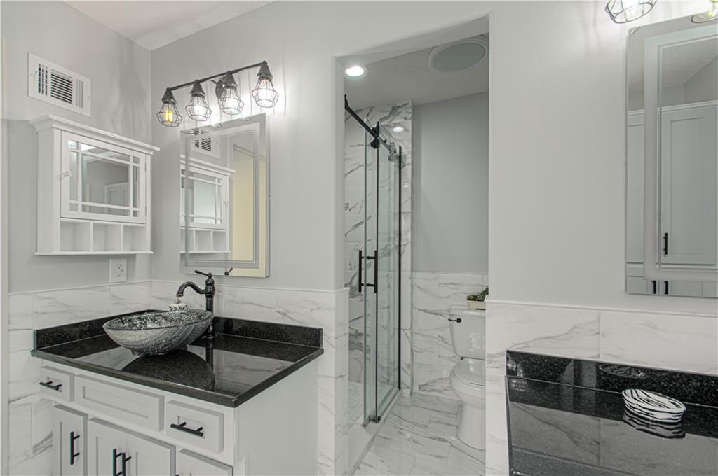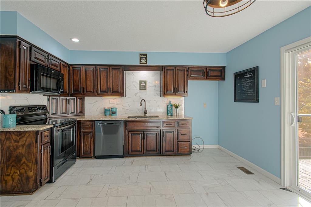 Charming Updated Home with Peaceful Lake Views from your Deck! This home is all about comfort and relaxation in a beautiful setting! This home has wonderful open concept living space. The large light and airy Great Room has vaulted ceiling and striking brick fireplace which opens into the dining room with bamboo flooring! The updated kitchen effortlessly flows into the dining room, with stained kitchen cabinets, designated pantry, granite countertops , stainless steel appliances and breakfast bar. A spacious 12x12 deck is accessed from the kitchen sliding door. The huge primary bedroom is en suite with walk in closet, and luxurious hotel style updated bathroom-including separate double vanities with upgraded task lighting and lighted mirrors, extra storage, gorgeous tiled walls and a stunning walk in shower with floor to ceiling tile. The second spacious bedroom, Updated full bathroom and laundry closet are also on this level. The lower level includes the 3rd bedroom with an en suite bathroom! The finished walk out lower level offers extra space for a variety of uses—be it a game room, a home office, or your personal getaway for relaxation. Newer windows! Newer roof, air conditioner, hot water tank, dishwasher and stove! Custom Window treatments! Newer flooring including high traffic carpet, bamboo flooring and updated tile! Seller provides Old Republic Home Warranty! Enjoy the fabulous amenities in Lakewood including tennis/volleyball courts, swimming beach, boat ramps, athletic fields, swimming pools, courtesy docks and playgrounds! Whether you're enjoying the lake views or just relaxing in the backyard, this home invites you to experience effortless living and a laid-back lifestyle. Super convenient location near shopping, restaurants and highways! AAA rated Lee's Summit schools!