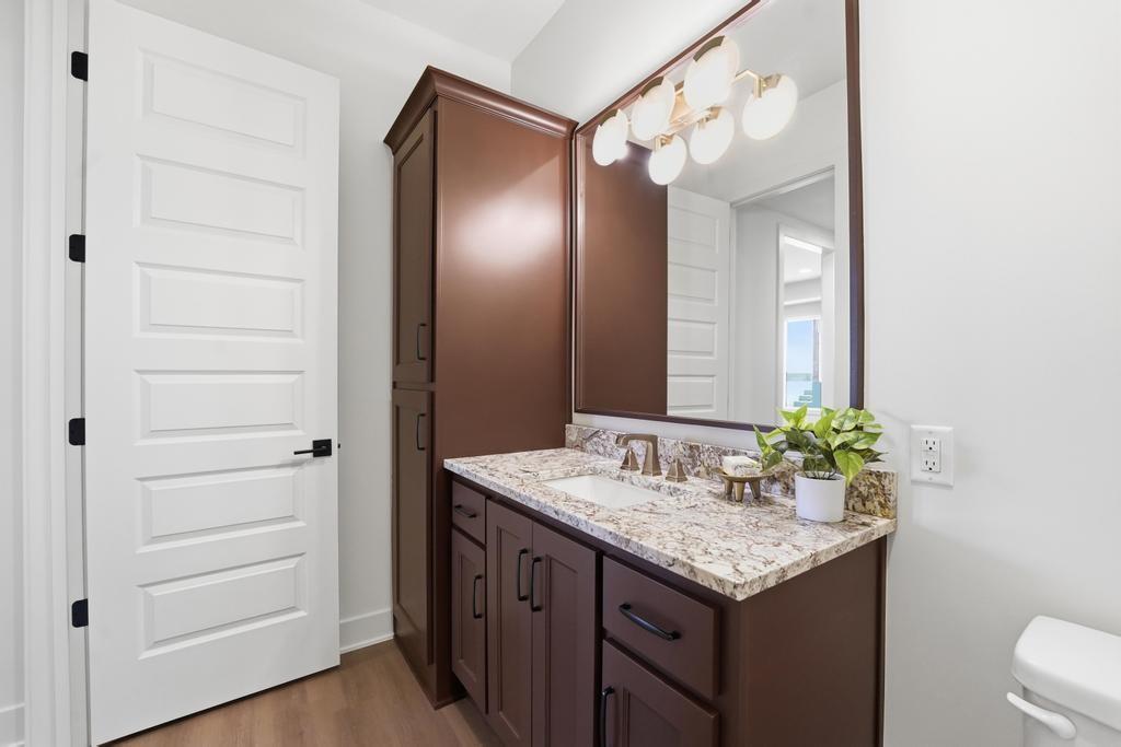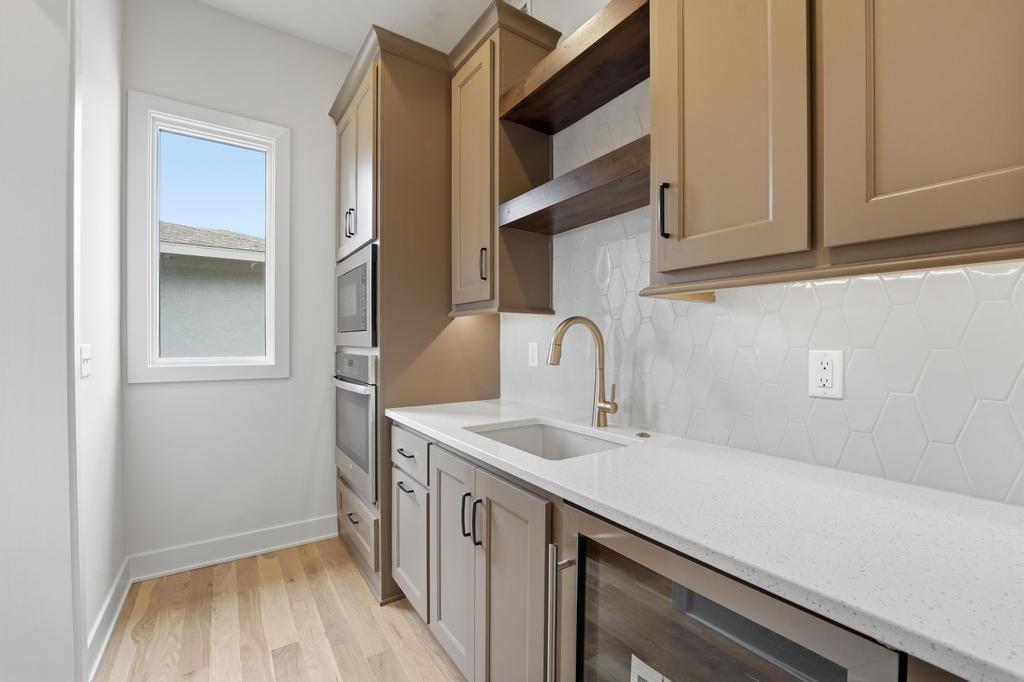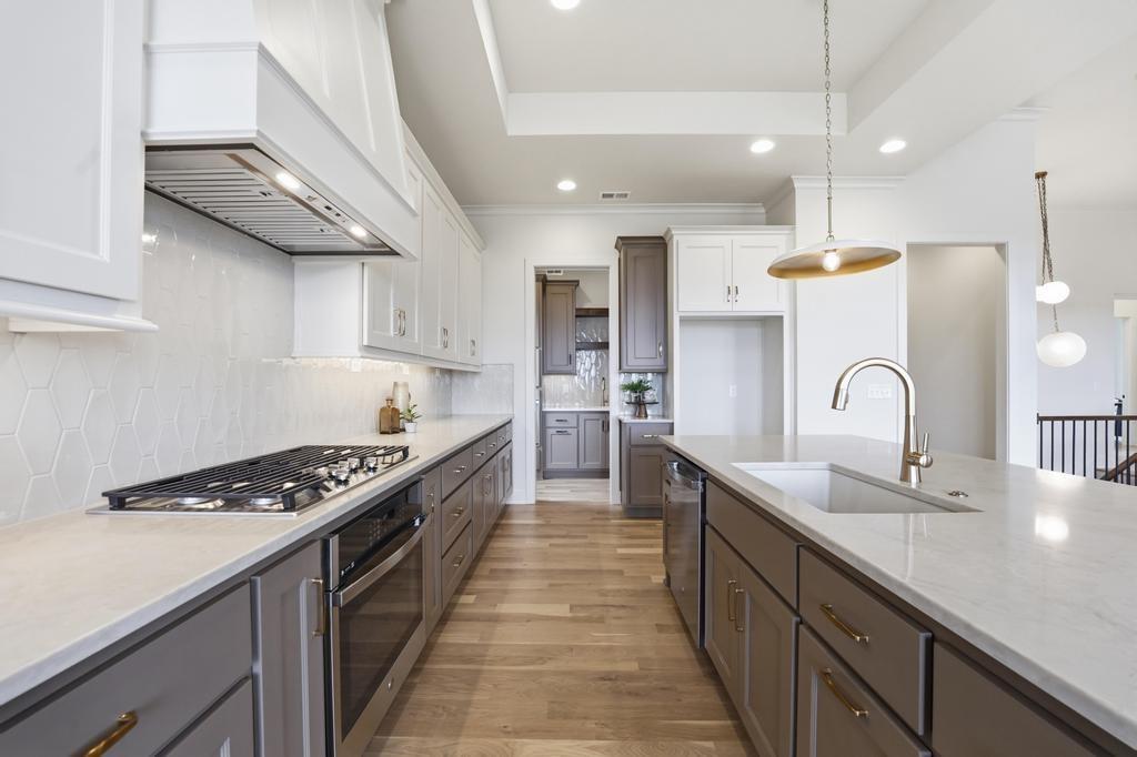 The stunning Emerson reverse 1.5 story plan by French Homes in Cedar Creek's newest community - The Estates of Canyon Oaks. Located in the award-winning Olathe School District, this reverse 1.5 story home has 4 beds, 3.5 baths, 3 car garage and sits on a walkout lot on a cul-de-sac. Step inside the double wide doors into the entry which leads you to the spacious family room with wood floors and fireplace with built-in cabinet surrounds. The gourmet kitchen features an island, custom cabinets with hood, cooktop, built in oven/micro and a generous sized prep pantry with storage, sink and beverage cooler. The eat-in dining space has a built-out space perfect for a hutch and also connects to the covered deck - perfect for morning coffee. The private main level primary suite offers a spa-like bathroom that includes double vanities, free-standing tub, shower with bench and a huge walk-in closet that conveniently connects to your laundry room. Main level also has a second bedroom, full bath and a mudroom with bench off the garage. The walkout lower level includes a large rec room with second fireplace, wet bar with island and two additional bedrooms, 3rd full bath and a half bath perfect for guests. Plenty of unfinished storage space left too. Enjoy Cedar Creek's amazing amenity package that includes 3 neighborhood pools, community clubhouse with exercise room and indoor basketball court, lit pickleball and tennis courts, access to 65 acre lake, monthly neighborhood events, walking trails and more.