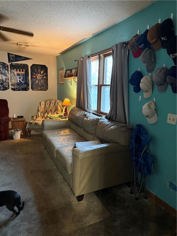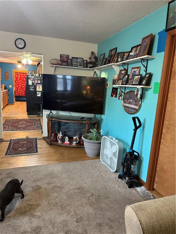 Carpeted living area featuring a textured ceiling and a ceiling fan