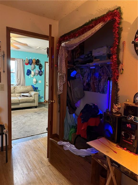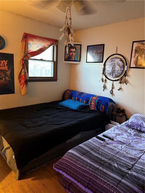 Bedroom with a textured ceiling, wood finished floors, and ceiling fan