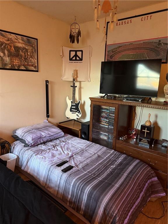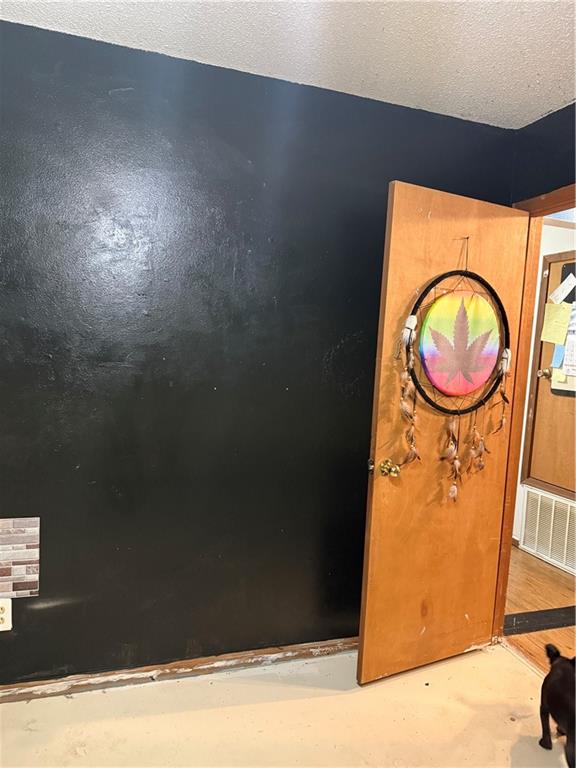 Bedroom with a closet, wood finished floors, and a textured ceiling