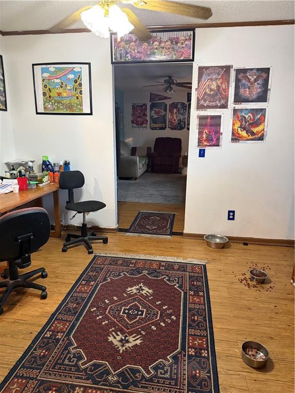 Office area with a textured ceiling, ornamental molding, ceiling fan, and wood finished floors