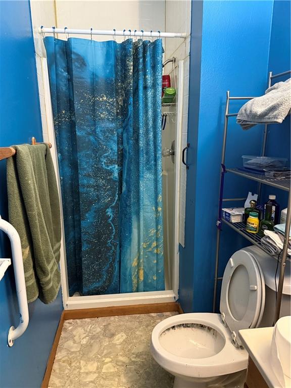 Bedroom featuring a textured ceiling, ceiling fan, and concrete floors