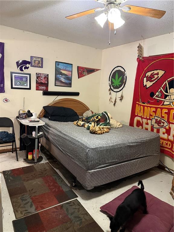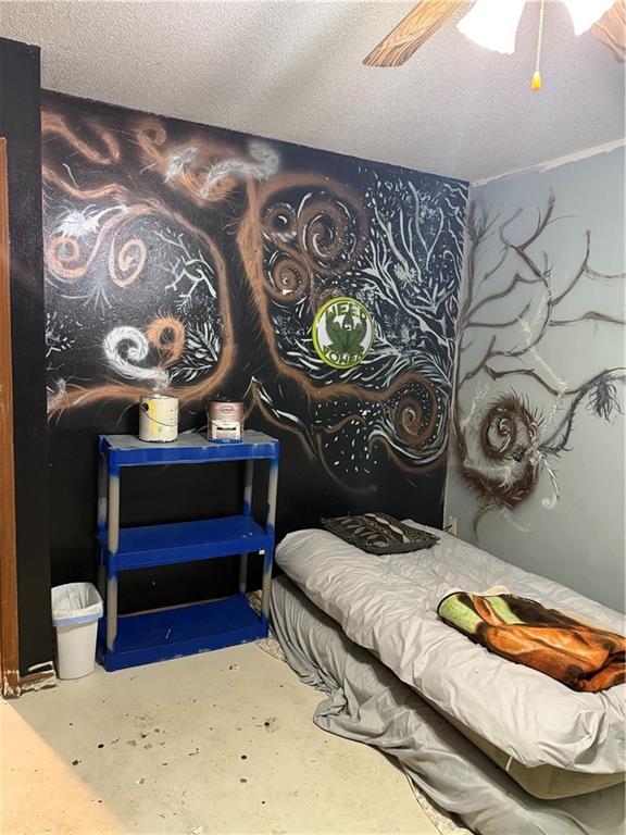 Bedroom featuring a textured ceiling, a ceiling fan, and concrete flooring