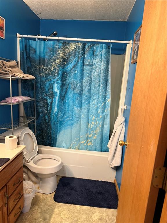 Full bathroom featuring shower / tub combo, vanity, and a textured ceiling