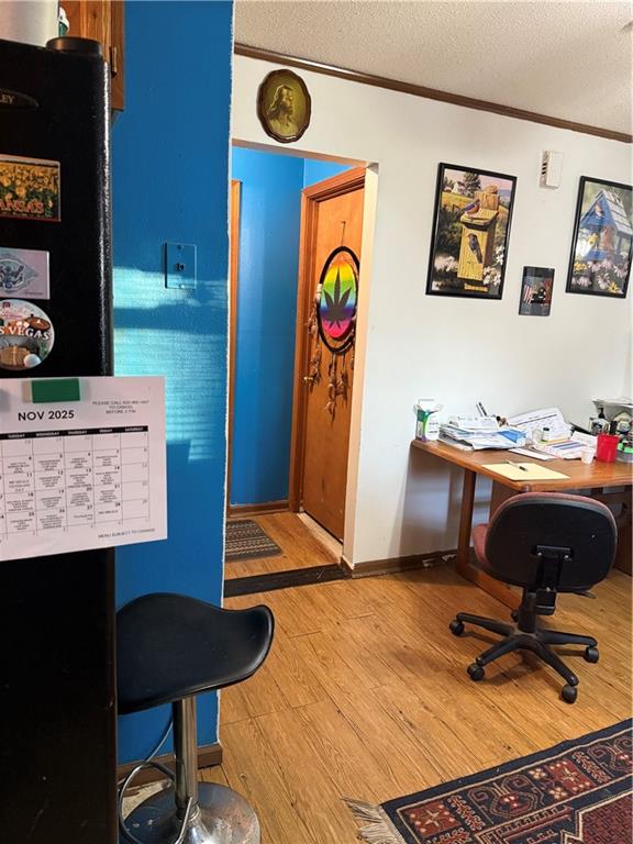 Home office with a textured ceiling, light wood-style flooring, and ornamental molding