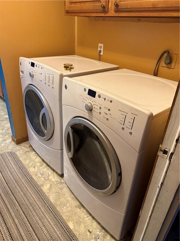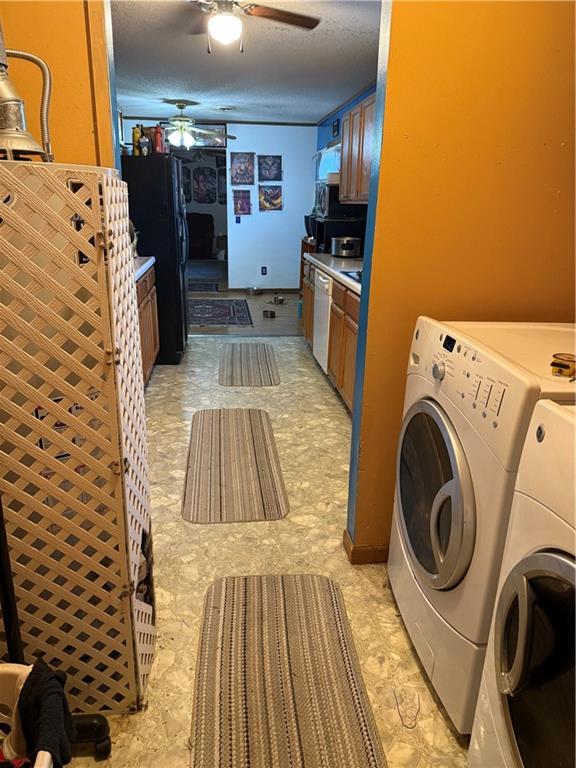 Laundry room featuring light flooring, a ceiling fan, and washer and clothes dryer