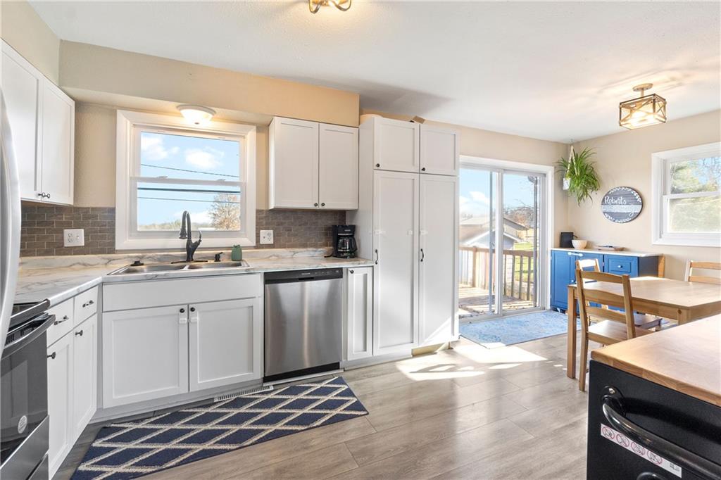 Move right into this well loved, beautifully updated split-level home featuring an open floor plan, fresh flooring, modern finishes, and warm wood accents throughout. The bright living room flows into the dining area and updated kitchen with stainless steel appliances, white cabinets, stylish backsplash, and a movable island. Enjoy three comfortable bedrooms and a fully updated bath on the main level, plus an additional living space/bedroom and half bath downstairs—perfect for guests, an office, or a playroom. Relax or entertain on the spacious deck overlooking a fully fenced yard with no neighbors behind you. Peaceful views and plenty of room to play!