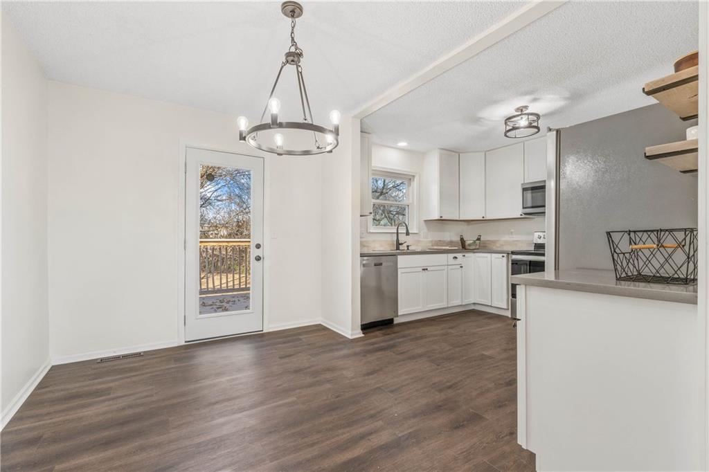 This charming 3 bedroom, 1 and 1/2 bath home features a split entry design. The heart of the home is a newly remodeled kitchen, boasting sleek stainless steel appliances and durable, solid surface countertops. A cozy coffee nook provides a perfect spot for morning routines. New flooring throughout brings a cohesive, modern look, and the bathrooms have been updated. The split level layout includes a bright main floor living area and lower level space perfect for a rec room or additional bedroom. The deck overlooks an extra large, fully fenced backyard, providing an area for recreation, gardening, and entertaining.
