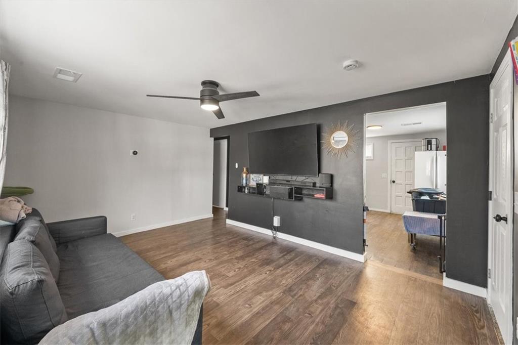Welcome to a bright and refreshed home that offers far more space than you’d expect. Inside, you’ll find updated flooring throughout, fresh paint, modern lighting, and thoughtful touches that make each room feel warm and inviting. The living area brings in great natural light and is anchored by a clean accent wall, built-in shelving, and a sleek ceiling fan. The oversized kitchen provides an impressive amount of storage, updated counters, newer appliances, and plenty of room to add a dining setup or coffee bar. This home offers flexible living with multiple bedrooms and bonus spaces that can easily serve as offices, playrooms, or creative studios. Each room has been improved with updated floors, modern fixtures, and appealing neutral finishes to make the home move-in ready. The renovated bathroom features fresh tile, a newer vanity, and a clean, modern look. A dedicated laundry area adds even more convenience and storage options. With its mix of updates, versatility, and useful square footage, this home is a strong fit for anyone needing extra rooms or multi-use spaces without sacrificing comfort or style.