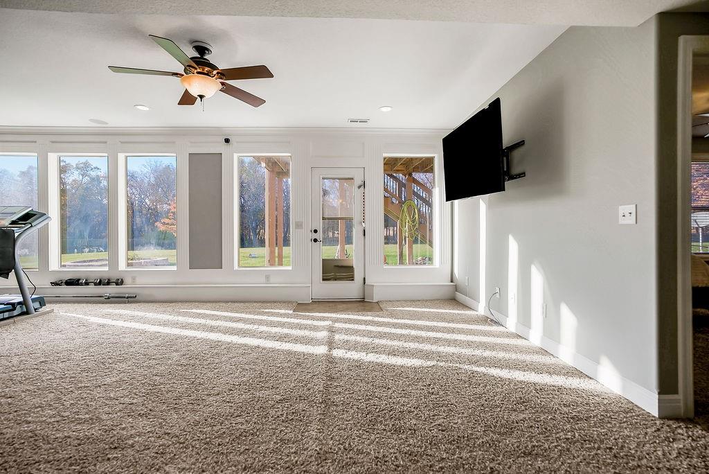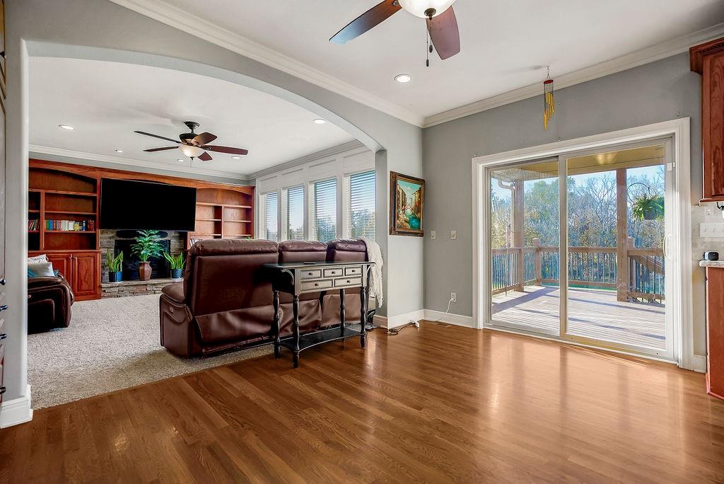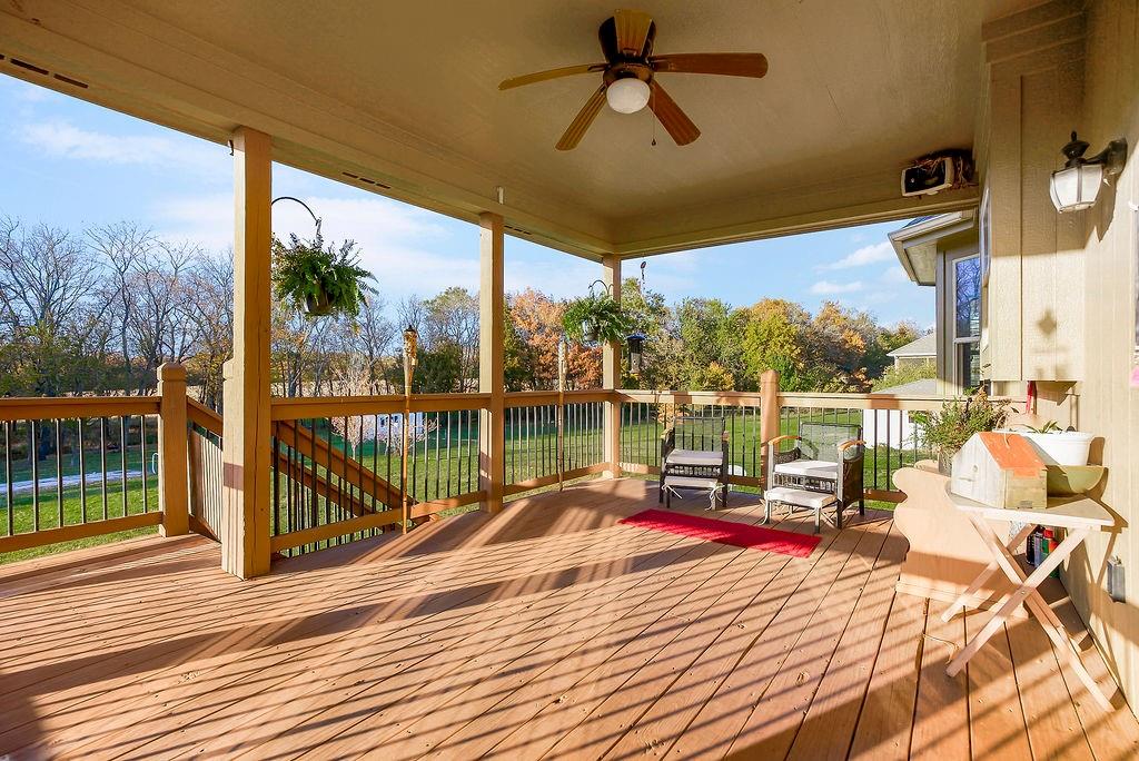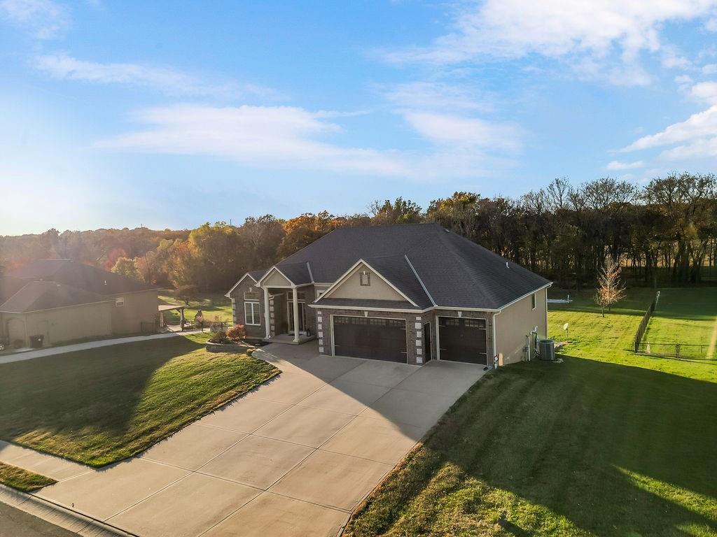Stunning Reverse Ranch on Nearly an Acre in South Pleasant Hill. Experience peaceful, country-style living in a beautifully maintained neighborhood just minutes from 7 Highway. This inviting reverse ranch offers an open-concept kitchen and living area featuring an island, granite countertops, stained cabinetry, and a gas range. The spacious yet cozy living room includes built-ins for storage and display, along with a gas fireplace. Expansive windows throughout the home fill each space with natural light. A formal dining room, main-level laundry, and generous primary suite provide exceptional comfort and convenience. The luxurious ensuite features dual vanities, a whirlpool tub, and an oversized walk-in closet. The finished walkout lower level is perfect for entertaining, complete with a large family room, kitchenette/bar, and a third full bathroom. Parking is abundant with a three-car main-level garage plus an additional rear bonus garage—ideal for a workshop, tools, or extra storage. Relax outdoors on the covered deck overlooking the expansive backyard that backs to a serene forested area. The large lot and quiet street offer ample room for recreation and play. Additional unfinished storage space adds even more flexibility. No HOA!