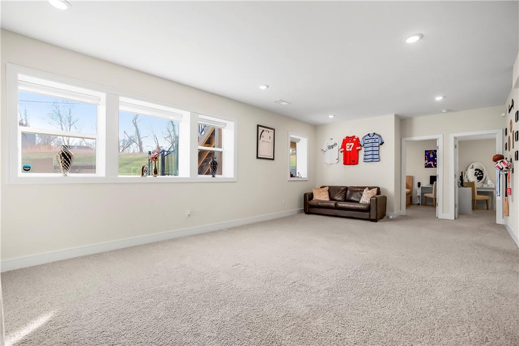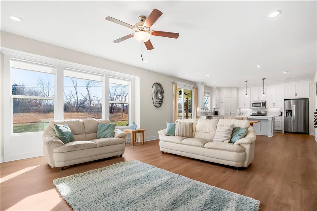 This beautiful 3 bedrooms and 2 and a half bath home is better than new. Main level features a primary suite fully upgraded. with plenty of designer features to enjoy including an expansive covered deck, large custom windows throughout for natural lighting, white cabinetry, popular wide plank wood flooring, brushed nickel hardware, stainless steel appliances with gas range. Downstairs features 2 bedrooms and a full bath, including a large finished rec room with plumbing for a wet bar rouged in! Tons of storage, 3 car garage including a 4ft front extension! This home is situated on a cul-de-sac lot in the picturesque neighborhood of Lakeshore Meadows, surrounded by mature trees, in a western Olathe community near Lake Olathe. Lakeshore Meadows is less than 10 minutes from K7/I-35 hwy and a short drive to the Lake Olathe recreation center, Prairie Center Park, KC Winery, and the NEW Cedar Niles trail system.