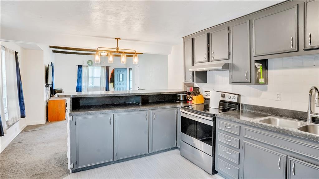Kitchen featuring gray cabinets, electric stove, dark countertops, a peninsula, and tasteful backsplash