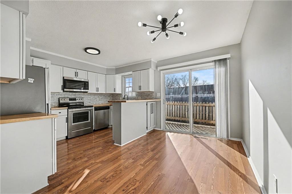 Discover low-maintenance living with this Meadowbrook Manor Townhome! This updated 2-bedroom, 1.5-bath townhome offers a great opportunity for those looking for that lock-and-leave lifestyle. The main level features a stylish kitchen equipped with stainless steel appliances and beautiful butcherblock countertops. Enjoy meals in the eat-in kitchen, which opens to a private deck for outdoor relaxation. Upstairs, find two carpeted bedrooms complete with ceiling fans for added comfort. A full bath serves this level, while a convenient half bath is on the main floor. The basement has in-unit laundry and accesses the attached 2-car garage. A low-maintenance lifestyle awaits, thanks to the HOA covering building maintenance, lawn care, snow removal, and trash pickup, pool & play area! Don't miss this turnkey opportunity—schedule your tour today!