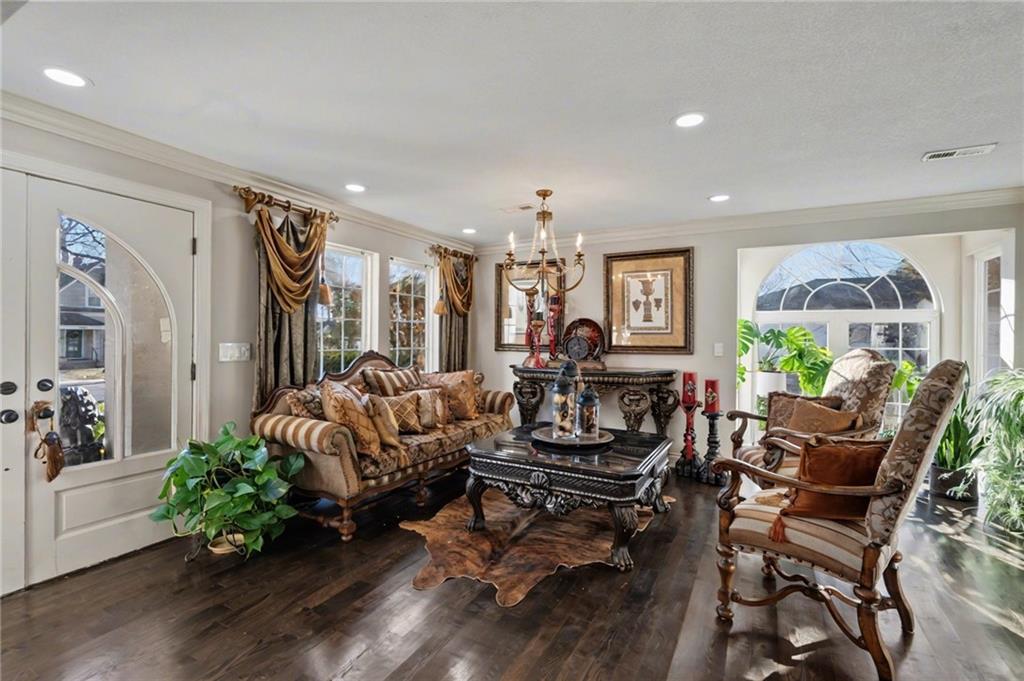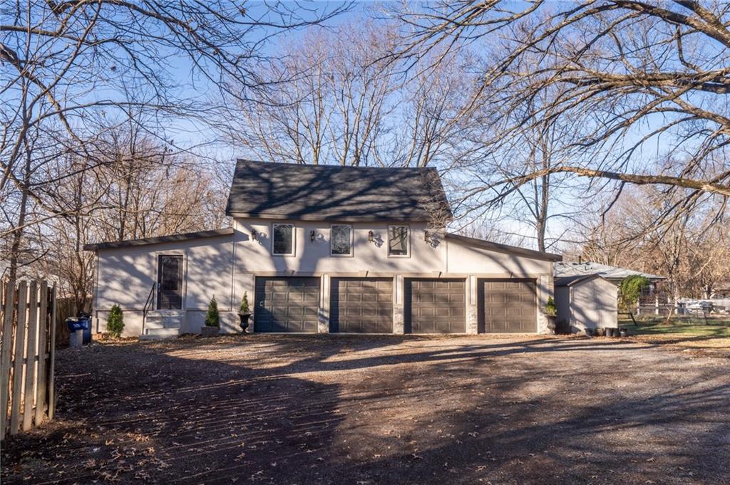 Welcome home to this exceptional and elegant 5 bedroom, 3 bath home in the heart of De Soto. This stunning home features 5 spacious bedrooms, 3 full bathrooms, an open floorplan with hardwood flooring, large windows allowing for an abundance of natural light throughout, plus so much more!! An added feature is the large detached 4 car garage with workshop, office and recreation room on almost 1/2 acre lot. As you step into the entryway you are greeted with tall ceilings, picture windows, and gleaming hardwoods. The beautiful living room has a South facing solarium for plant lovers or a sunny reading nook. The spacious kitchen has beautiful granite countertops and backsplash, 36” gas cooktop, a generous kitchen island for culinary space and seating for four, plus a pantry with pull-outs. The dining room and family room spaces are connected to the main area while also creating a cozy feeling with custom pillars and mouldings, creating a floorplan perfect for entertaining or large family gatherings. Full bath just steps from the main level bedroom that opens to the covered deck with fireplace and quiet yard. Upstairs features four more bedrooms with large closets, a hall bath and primary suite with double vanity, walk-in closet and tiled shower. The largest bedroom has a walk-in closet and balcony. After a long day, relax in the cozy backyard under the covered deck overlooking the fireplace and additional terraced decks. From the custom interior lighting, beautiful trim, windows and doors, to the exterior spaces, balcony, and large yard, this home has exceptional design details both inside and out! Just a short walk away from quaint downtown De Soto and near De Soto schools, the peaceful Lexington Lake Park, and within an easy commute to KC, Lawrence, & surrounding areas, this property has it all! No HOA is ideal for using the detached garage for business or hobbies.