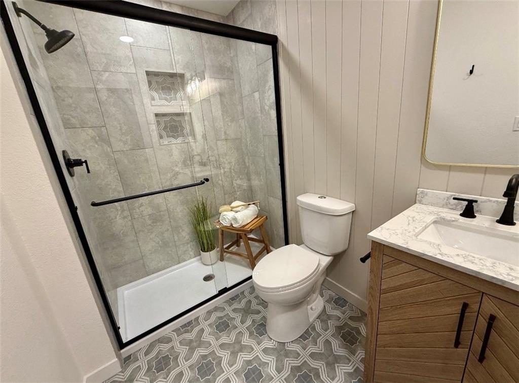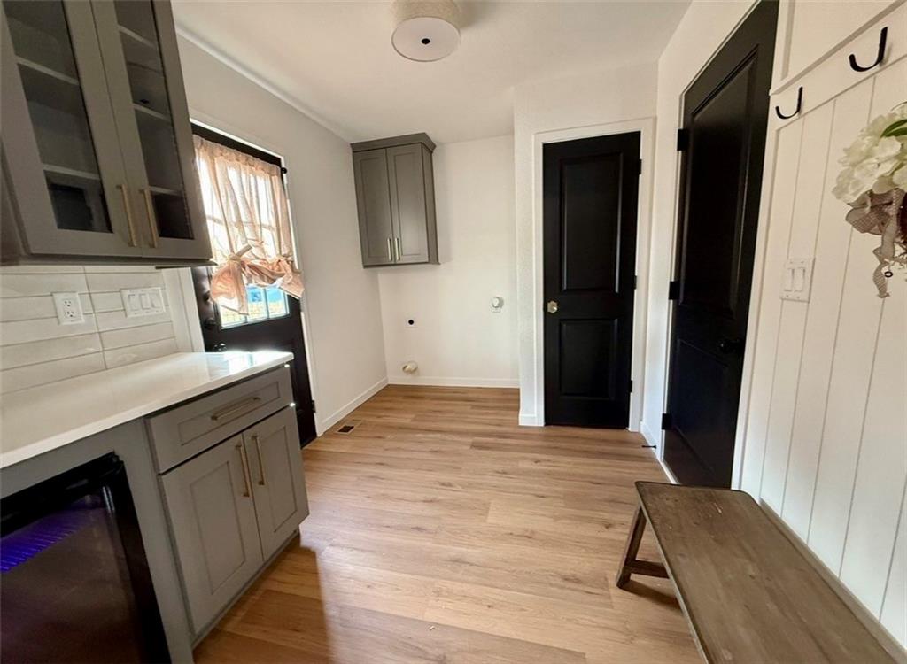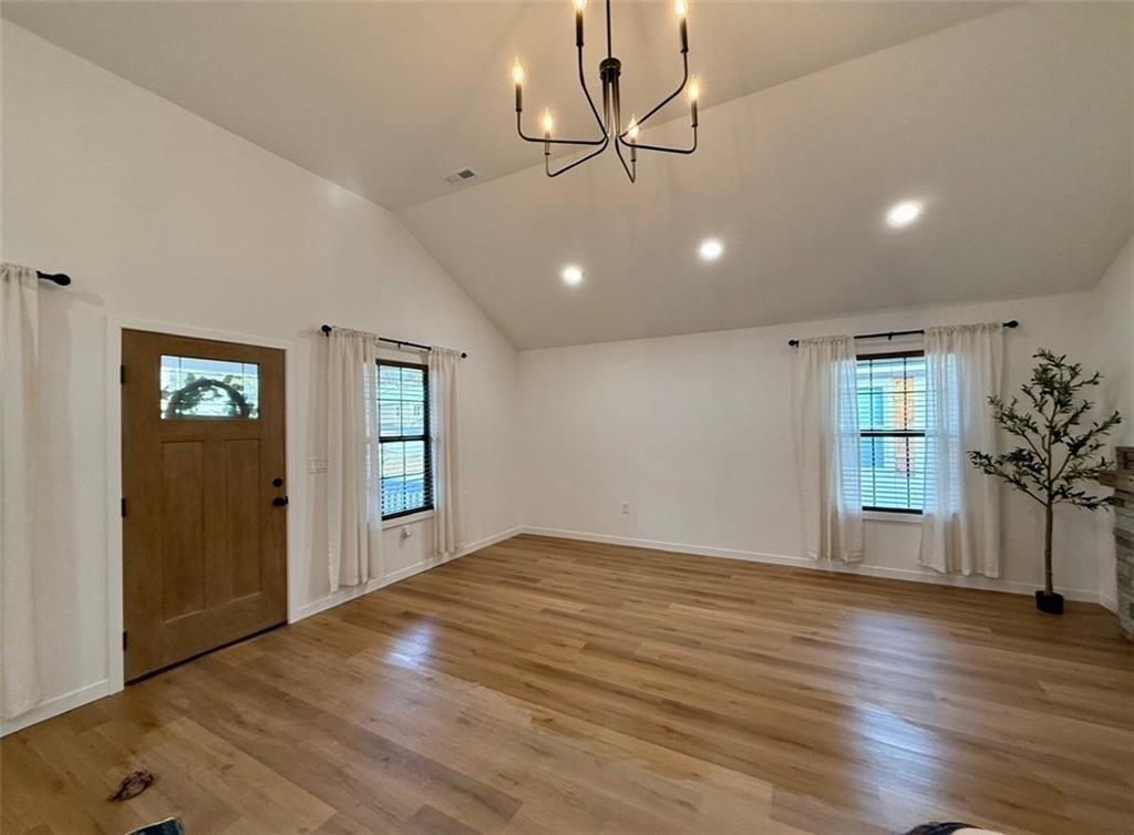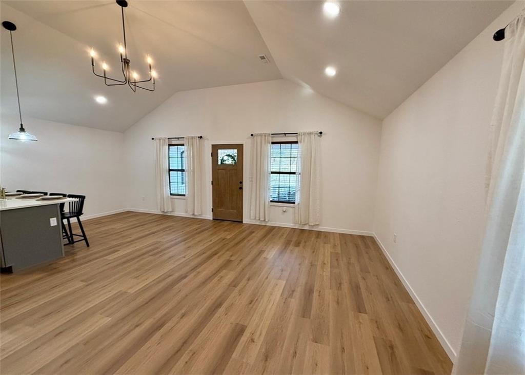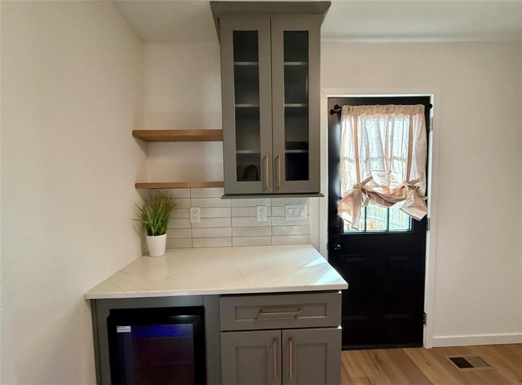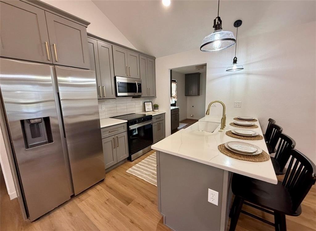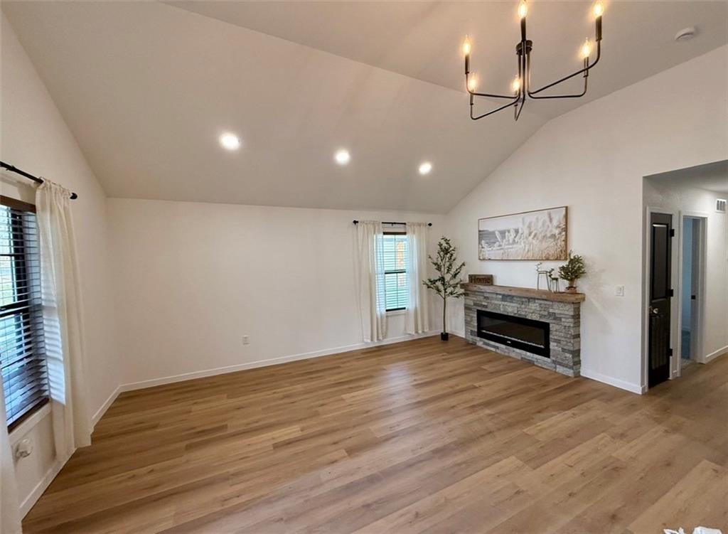 Stylish living awaits! This stunning new construction home on a foundation features 3 beds and 2 baths with modern design and charming details. Interior features many upgrades including extra tall kitchen cabinets, quartz countertops, a beverage center, stone fireplace, tiled bathrooms and walk in closets. Waterproof flooring, peninsula seating for four, and even a 220v outlet in the garage for a vehicle charger or large tools. Outdoor living is a dream with welcoming covered front porch, a back patio ready for warm weather get togethers, and a wood fenced backyard. Situated on a quiet street, this home is move in ready and designed for comfortable and stylish living!