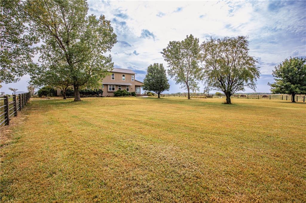 Sitting at the end of a nearly half mile driveway is this unique, 2985 square foot, 3 bedroom, 2 bath, 1 story home on 20 acres, more or less, in Anderson County, KS. You'll find an open floor plan which includes a huge master suite wing that is connected to the main body of the home by way of a large office which could be used a library, home school room or family room. Off that suite is your own private sun room in which you will enjoy picturesque views of the countryside and neighboring lake. The main body of the home is wide open with the kitchen, dining and family rooms designed for easy communication and entertaining! The upstairs includes two large bedrooms with a large bathroom. You'll love the hard wood floors throughout and everywhere you look there are windows, lots of windows. Natural light flows in abundance. The home sits on a full unfinished basement ready for your finishing touches or storage. There is a nice 60 x 60 metal horse barn and a nice 30 x 40 metal detached garage/shop! The map is for general reference only and may not reflect exact locations or dimensions. Taxes TBD. Aerial map, created with Surety Pro paid subscription & used with permission from AgriData, Inc. The map is for general reference only and may not reflect exact locations or dimensions.