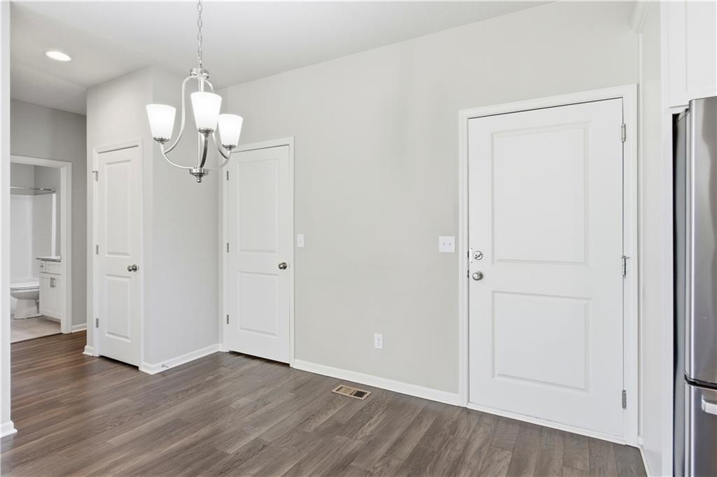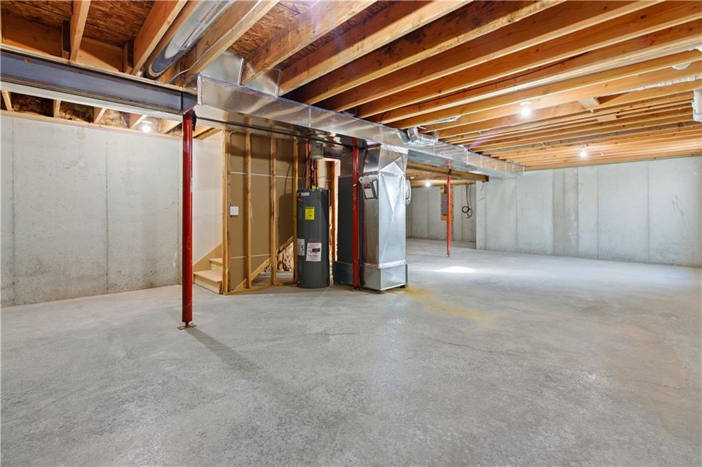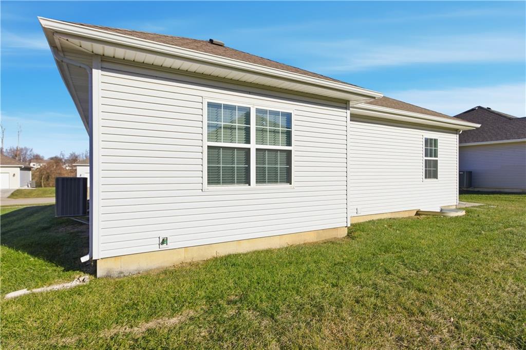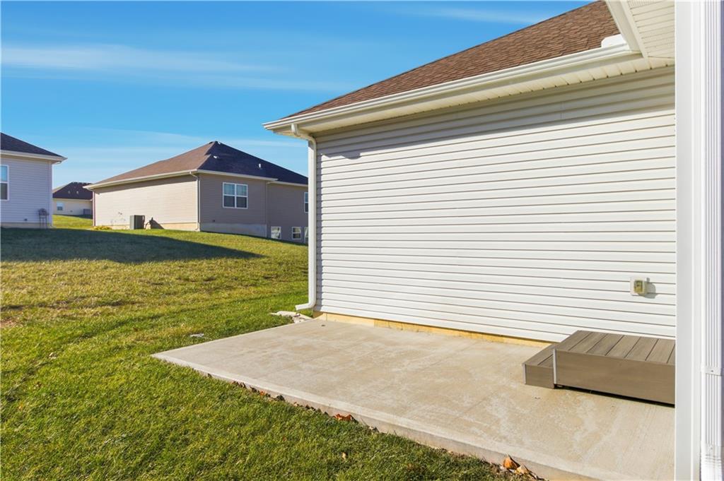 Welcome to maintenance-free living in this 55+ community home, ideally located just one mile from The Legends and Village West shopping district—soon to be the hub for all Kansas City sports! Open floor plan w/ beautiful hardwood floors throughout the main living areas. The spacious great room boasts a large vaulted ceiling, creating an airy and inviting atmosphere. The kitchen offers plenty of cabinet space, granite countertops, a pantry, and a full stainless steel appliance package. The primary bedroom is generously sized with its own vaulted ceiling, a walk-in closet, secondary closet and a private bath complete with a large shower. Both bathrooms feature ceramic tile floors for easy maintenance. Enjoy relaxing evenings on the nice back patio or the front charming country porch. The large two-car garage provides plenty of parking and storage space. This energy-efficient, all-electric home is equipped with heat pumps for year-round comfort. Plus, a HUGE unfinished full basement offers endless possibilities for additional living space or storage.