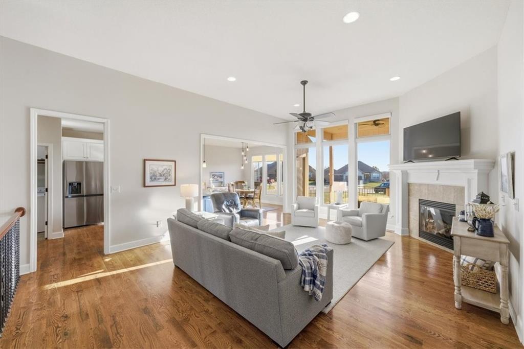 Like new home in a GOLF COURSE community! Highly sought after original Villa Section with LOW monthly HOA, just $105 per month! Optional additional annual HOA dues available for use of the pool. Ranch plan with three bedrooms on the main floor and one on the lower level, plus two large living areas and tons of storage. This beautiful home, lovingly and meticulously cared for is move-in ready. New shades in living and dining rooms and painted kitchen cabinets. Side entry garage and an impressive front entry combine for great curb appeal. Located on a cul-de-sac. Lawn Maintenance and Snow Removal provided by the HOA. The Falcon Lakes Villas community is uniquely welcoming, friendly and connected, providing a "lifestyle", not just a location. A public restaurant at the club house, food trucks, a bunco group, book clubs, pickleball group, and water aerobics are some of the opportunities available. With quick and easy access to K-7, it is an easy 30 minutes to the airport and to many parts of the metro. Just 10 minutes to the Legends Shopping and Entertainment District. Acclaimed Basehor-Linwood Schools.