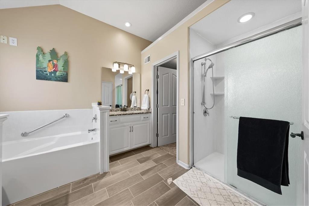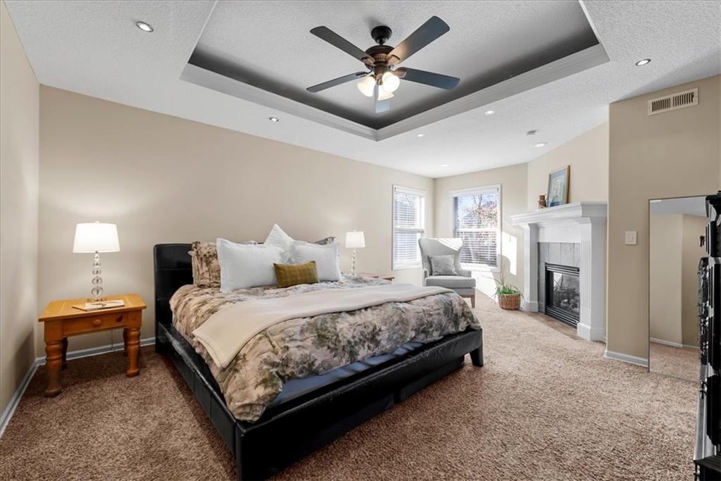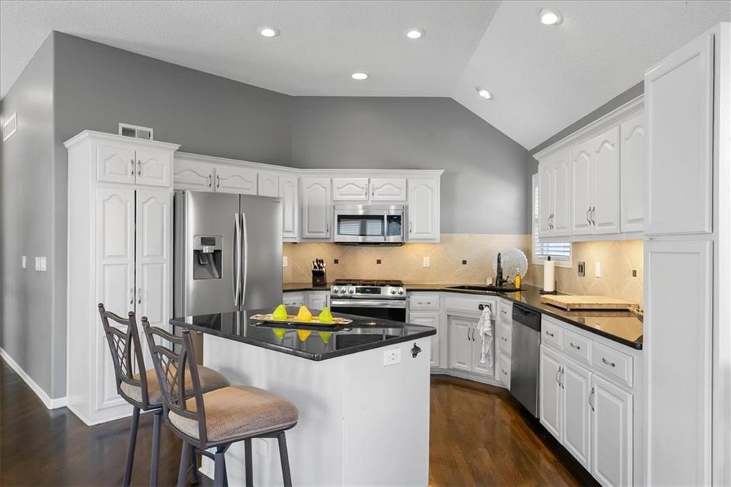 Welcome to this beautifully maintained atrium split, offering the perfect blend of modern updates, generous space, and everyday comfort. Step into the vaulted main level, where abundant natural light fills the open kitchen, dining, and living areas—ideal for both everyday living and effortless entertaining. The updated kitchen features crisp white cabinetry, stainless steel appliances, ample counter space, and a central island that truly serves as the heart of the home. The spacious dining area seamlessly adjoins the kitchen, creating a welcoming space for gatherings large and small. The primary suite is a true retreat, highlighted by abundant natural light, a second fireplace, and an upgraded en-suite bath with a separate tub and shower, double vanity, and a generous walk-in closet. With multiple living areas, this home offers plenty of room to spread out. The walk-out lower level boasts a large recreation room with a third fireplace, access to a fourth bedroom and third full bath, and direct access to the patio—perfect for guests, extended family, or multi-generational living. Outdoors, enjoy a large backyard featuring a deck just off the kitchen and an open patio below the walk-out level, ideal for relaxing or entertaining. This home delivers the space, style, and thoughtful updates today’s buyers are looking for—don’t miss the opportunity to make it yours.