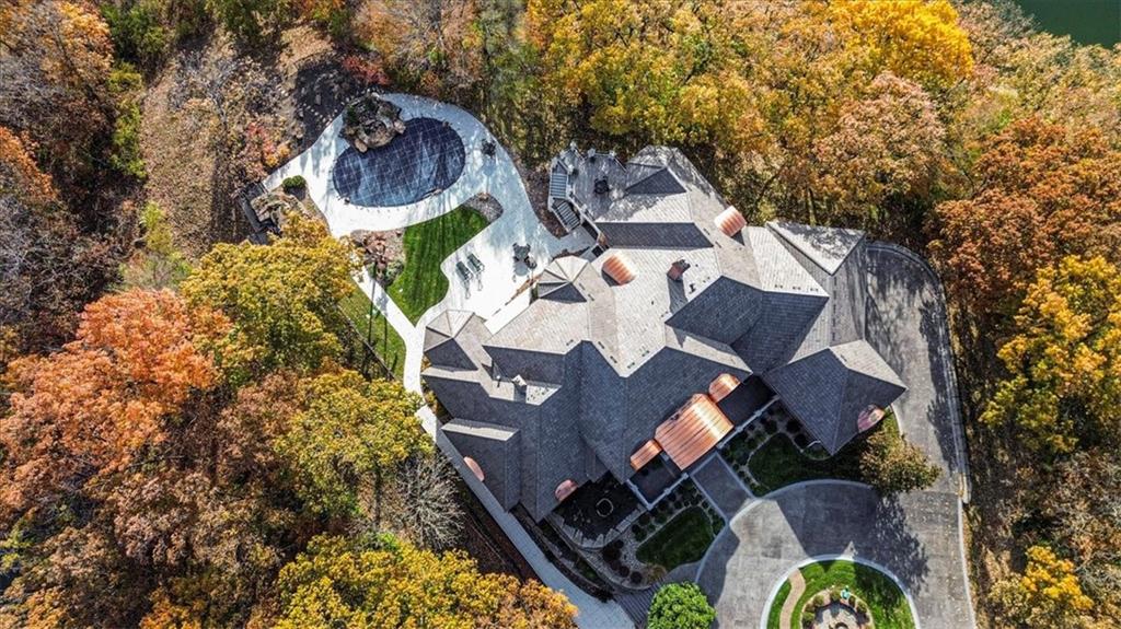 A most remarkable Home in the WEST SHORE area of RISS LAKE in Parkville, Platte County, Missouri. Relax in the Security provided by this Reserved Gated Community. You are greeted with an Impressive Circular Driveway and Stylishly Designed Home featuring an Extensive Glass Entry. The Concrete Tile Roof (replaced 2 years ago) caps a Full Brick Exterior with Coin Corners, Herringbone and Soldier Brick patterns. Inside are Soaring Ceilings on the main level with Entry Chandeliers that raise and lower for cleaning, Electric Blinds, Whole House Sound System and Custom Lighting throughout. A Suspended Curved Stainless Steel, Brass and Glass Staircase leads you from the Terrace Level through the Third Level of this Amenity Rich Home. The Theater Room, Gym, Full Bath with Steam Shower, Full Bar, Entertainment Room, Gourmet Kitchen with VIKING Appliances plus a Second Kitchen with KitchenAid Appliances on the Terrace Level bring a luxurious feel to the home. Private Office, Playroom, Covered Lanai and 10-foot Basement ceilings will all add to your enjoyment of this home. This Custom-Built Home is attractively situated on a Large Estate Homesite on the Point of Riss Lake with an Expansive Deck offering an Excellent view of the 130+ Acre Lake. These Amazing Lake Views can also be enjoyed from virtually all the rear windows of the home. Upgrade your leisure time in the In-Ground Concrete Pool featuring a Waterfall, Hot Tub and SO MUCH MORE!! A must see!