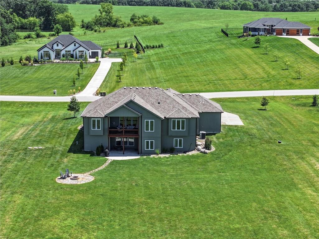 Nestled on a little over 3 acres in The Estates at The Ranch this home is a showstopper! Custom built with beautiful finishes. You will love the open floor plan, vaulted ceilings and box beams. Kitchen features upgraded appliances, a large walk-in pantry and soft close cabinets and drawers. Primary suite is oversized with an amazing closet and bath. 3 bedrooms on MAIN level for those that have small children or if multiple people need to be on the main level. Second smaller "secondary suite" includes a bath and walk in closet. Large lower level is stubbed for a wet bar/entertaining area with refrigerator. Two large storage areas. Storage area to the north could be a workshop. It is framed so you could put in double doors or a garage door for lawn equipment, ATV, boat or toys. The Covered deck, patio, fire pit and front porch make this home perfect for enjoying the outdoors. Country life close to the city. Minutes from 435, 169, I-29, 291 and 152. Home is very close to Smithville Lake and Paradise Point Golf Course. Enjoy the small town feel with all the amenities. In the highly rated Smithville School District. Buyer or buyer's agent to verify tax, sq ft and school district information.